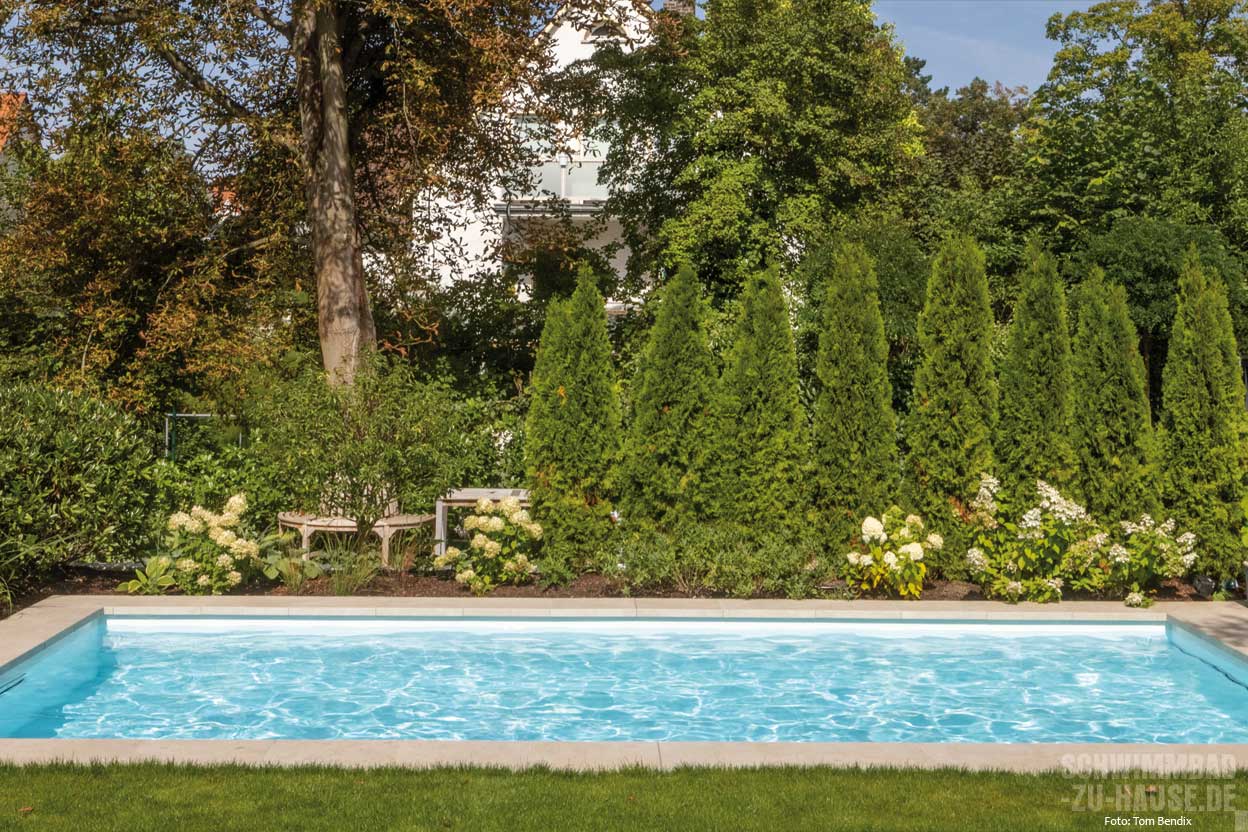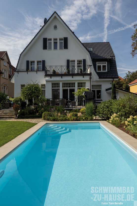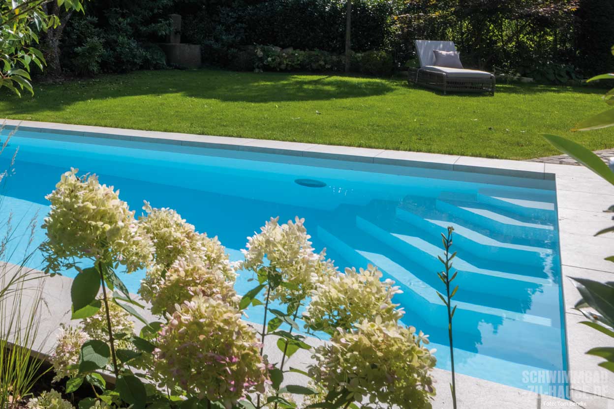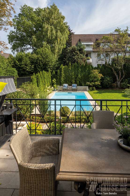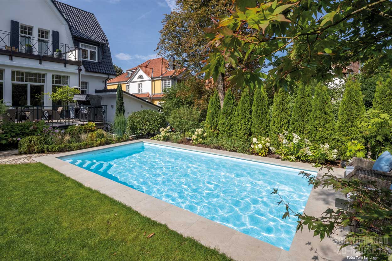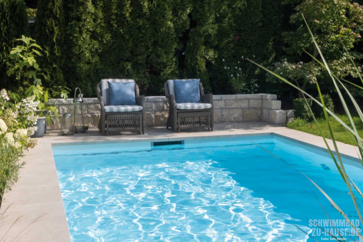 Mit einem 7 x 3,50 Meter großen VPS-Becken aus Hart- PVC wurde die zur Verfügung stehende Fläche optimal genutzt. Das Material ist langlebig und resistent gegen Chemikalien und Osmose. Nur ein Pflanzbeet trennt den Pool von Haus und Terrasse. Von dort führt ein gepflasterter Weg direkt zum Pooleinstieg über eine fünfstufige Treppe, die sich nach oben hin verjüngt. Auf der gegenüberliegenden Beckenseite, wo sich der Skimmer befindet, lädt eine gemütliche Sitzgruppe dazu ein, mit dem Blick über das Wasser im Schatten der Bäume zu entspannen. Alle Materialien sind farblich aufeinander abgestimmt, wobei die helle Poolumrandung aus großformatigen Feinsteinzeug-Platten dem Wasser eine zusätzliche Strahlkraft verleiht.