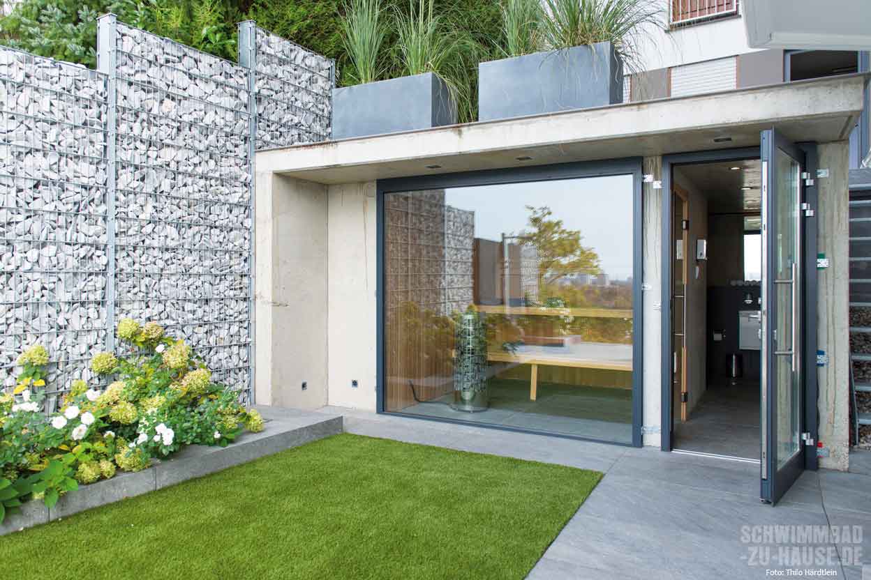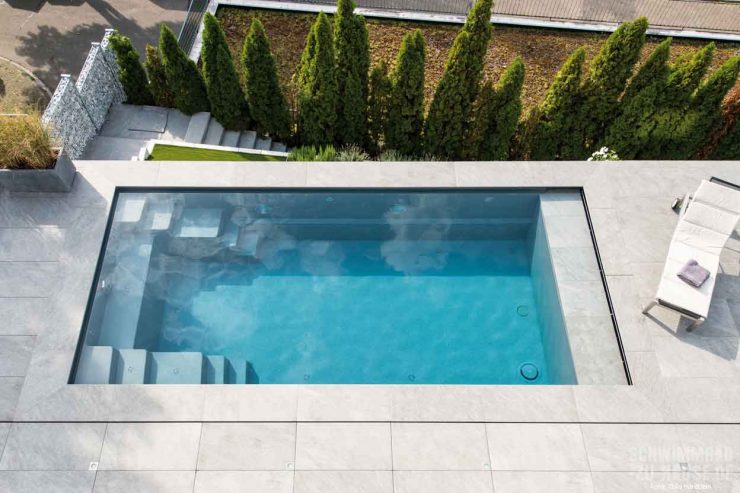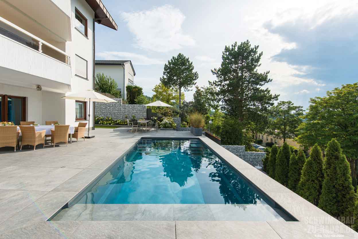 Aufgewachsen in einer Familie mit vier Geschwistern erinnert sich die Bauherrin noch gut daran, dass eines der Kinder für den elterlichen Pool früher immer den Reinigungsdienst übernehmen musste. „Daher war ich zunächst skeptisch, als mein Mann die Idee eines eigenen Schwimmbads im Garten hatte“, verrät sie im Gespräch mit haus und wellness*. Dies wollte sich die Bauherrin auf keinen Fall noch einmal antun. „Wenn ich mehrere Stunden in der Woche für die Wasserpflege und Säuberung des Beckens aufbringen muss, so überschattet dies den Wellness-Aspekt zu sehr“, erklärt die Bauherrin im Weiteren. Trotzdem überredete ihr Mann sie recht spontan, gemeinsam die Aquanale in Köln zu besuchen.
