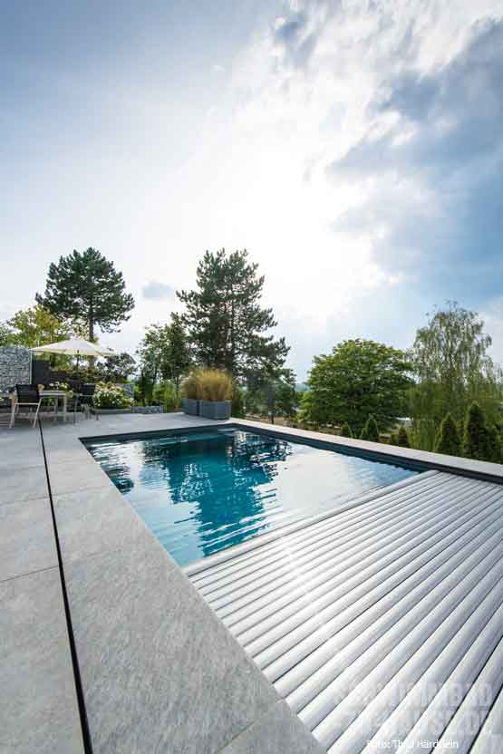 Das verbaute Beckenmodell heißt übrigens „Elegant 80“ und hat eine Größe von 8 x 3,70 Meter. Zur Desinfektion dient eine vollautomatische, zuverlässige Salzwasser-Hydrolyse-Anlage, die das Badewasser weich macht. Nebeneffekt: Das Wasser ist leicht salzig, dafür aber völlig frei von Chemie. Letzteres sagt der nachhaltigen Philosophie der Bauherren besonders zu. Zur Abdeckung dient das Solarrollo „Beach Line“ im eleganten Alu-Design, das den Wasserstand hoch hält und die Sonneneinstrahlung nutzt, um das Wasser zusätzlich aufzuheizen. Das entlastet die Poolheizung und die sowieso schon sehr sparsame Luftwärmepumpe. Desweiteren nutzt der Bauherr regelmäßig die in den Beckenkörper eingebaute kräftige Gegenstromanlage, da er sich täglich mit seinem ganz persönlichen Schwimmtraining fit hält.