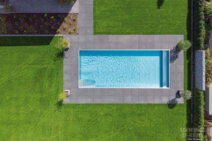 So wie die in schlichtem Grau gehaltene, zeitlos-funktionale und pflegeleichte Beckenumrandung schlägt auch der Pool keine exaltierten Kapriolen, sondern wurde auf dem Fundament der technischen Zuverlässigkeit gebaut, um einfach das zu leisten, was sich die Bauherrenfamilie wünschte: einen heiteren Ort für die ganze Familie. Am besten für die Ewigkeit.