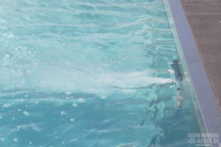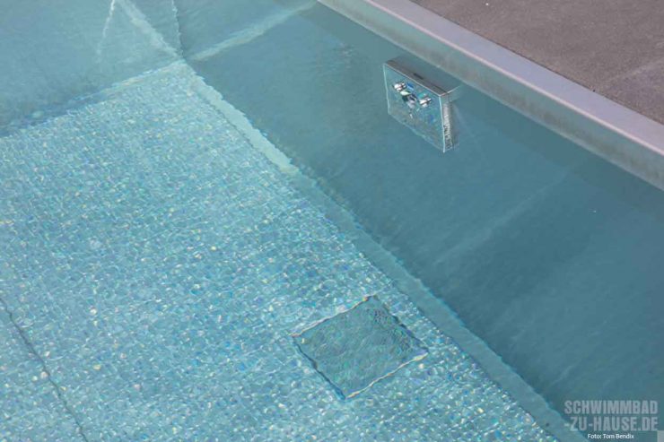 Die Wahl fiel auf ein reichlich wand- und bodenisoliertes V4A-Edelstahlbecken von durchgängig anderthalb Meter Tiefe. Das Skimmerbecken mit hochliegendem Wasserspiegel verfügt über zwei Oberflächen-Absauger. Optisch-gestalterische Schleifen wurden aus besagten Gründen wenige gedreht – lediglich für RGB-Unterwasserscheinwerfer entschied sich die Familie. Vier an der Zahl sind es, die nun das Wasser je nach Tageszeit, Lust und Laune mit Farblicht bespielen.