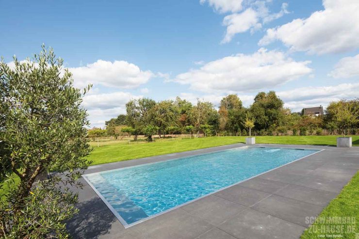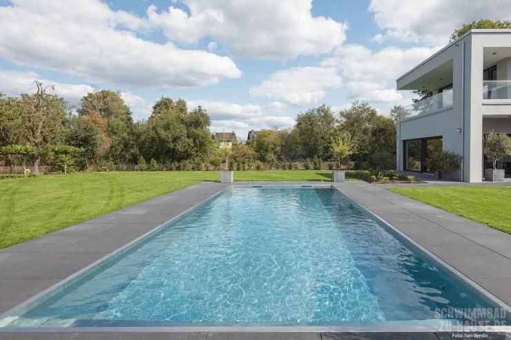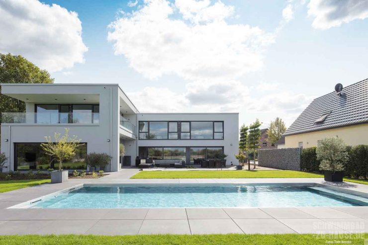 2017 wurde der zweigeschossige Bungalowbau fertiggestellt und das rückwärtig sanft und großzügig auslaufende Gartengrundstück in sonniger Lage mit einem 12 x 5 Meter großen Pool versehen. Beauftragt mit der Umsetzung aus einer Hand wurden die Meerbuscher Spezialisten von SSF Pools by Klafs.