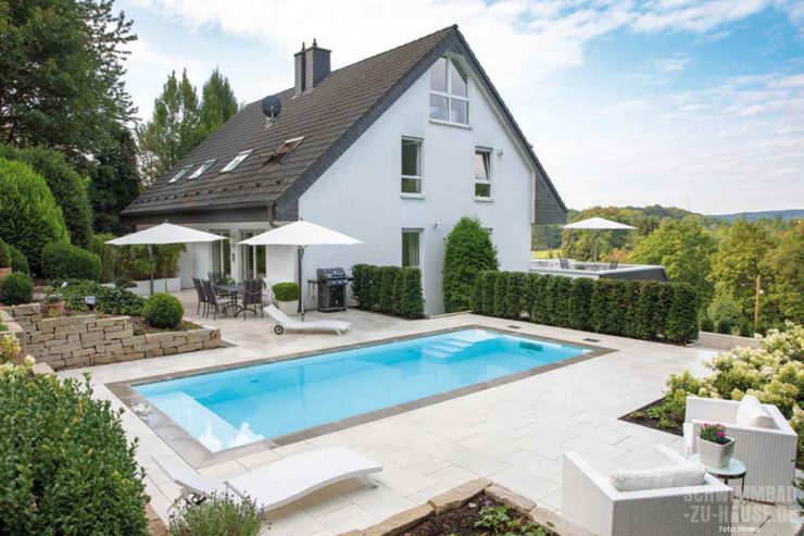 Wann immer es ihnen zeitlich möglich ist, begibt sich das Ehepaar Koch aus Herdecke nach draußen. In der Natur lässt sich der Stress des Alltags vergessen, man ist aktiv, bewegt sich. „Wir sind begeisterte Sportler und auch Schwimmen gehört zu unseren Hobbys. Überhaupt bewegen wir uns sehr gerne an der frischen Luft“, verrät der Bauherr im exklusiven Gespräch mit haus+wellness*. Das idyllische Hanggrundstück der Familie, das kaum zehn Minuten Autofahrt von der bekannten Ruhrbrücke und nur einen Katzensprung von Dortmund entfernt liegt, ist von dichtem Wald umgeben – eine ideale Ausgangssituation demnach für die sportbegeisterten Frischluftfans.