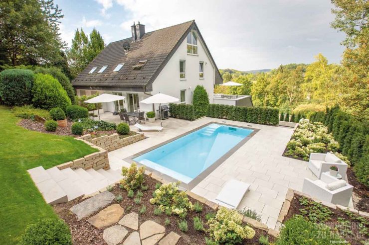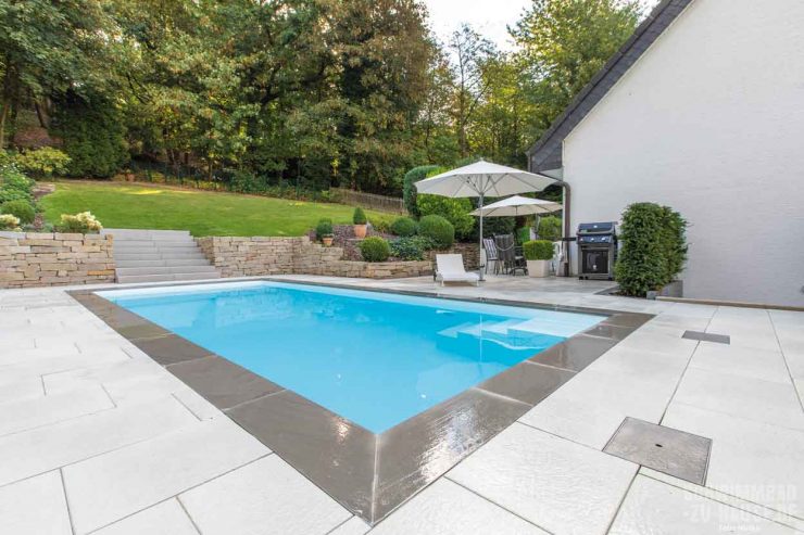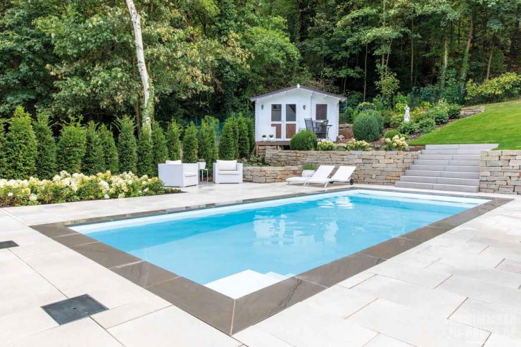 Jetzt fügt sich das rechteckige Becken „Skimmer Invisible“ mit seinen Maßen 7,50 x 3,20 x 1,50 Meter harmonisch in den Garten hinter dem Haus ein. Durch eine individuelle Lösung bei der Installation des Skimmers schafft dieses Modell einen dezenten Übergang zwischen dem Beckenrand und dem Wasserabfluss, während der Wasserspiegel möglichst hoch ist. Bei der Positionierung achtete man darauf, dass das Becken im Zentrum des Grundstücks und etwas versetzt zum Wohnhaus liegt. So ist die Sonneneinstrahlung maximal und das Raumgefühl beim Schwimmen nicht eingeschränkt. Eingefasst wird der Pool von einer dunklen Umrandung aus Stein, die einen Kontrast zum hellblauen Wasser bildet. Im Anschluss hieran folgt eine großzügige Terrasse aus hellen, großformatigen Fliesen, die Poolbereich und Terrasse raffiniert verbindet.