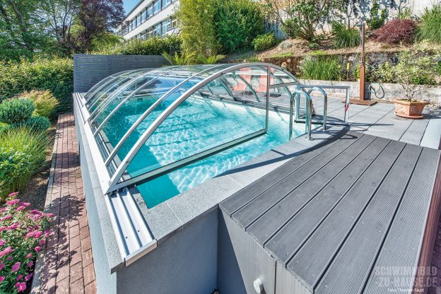 Letztendlich fiel die unkomplizierte Wahl auf ein Systemsteinbecken aus Styropor mit sandfarbener Folie und den Maßen 6,0 x 3,25 x 1,50 Meter. Das größere Problem beim Bau des Pools war die Lage des Grundstücks am Hang mit einer kleinen Zugangstreppe. Also konnte kein Bagger die Erdarbeiten bewältigen, sondern Menschenhand, welche fleißig die gesamte Grube ausheben musste. Zu allem Überfluss regnete es auch noch während der meisten Arbeitstage. Mit sehr viel Einsatz der Bauherren und der Erfahrung von Pool-Konzept konnte das neue Familienbecken letztendlich aber gesetzt und in Betrieb genommen werden. Damit der Regen die neuen Schwimmbadbesitzer nicht beim Baden stört, entschloss man sich eine Überdachung von Future Pool zu montieren. So wird die Badesaison verlängert und Strom- und Wasserpflegemittelkosten werden gesenkt. Auch die Sicherheit wird bei einem bedachten Pool erhöht.