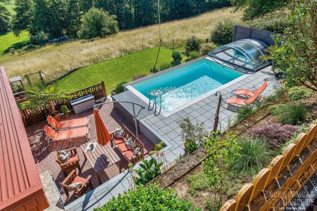 Für die Familie aus Aschaffenburg fing alles mit einem Quick-up-Pool an. Der Einstieg in die private Wellnesswelt war damit gemacht und bereits kurze Zeit später wollte man einen vernünftigen Pool, der am Hang platziert werden sollte. Zusammen mit den Mitarbeitern von Pool-Konzept wurde ein Projektplan erarbeitet, dann die Grube per Hand ausgehoben und das Becken gesetzt. Jetzt ist der Gartenpool das neue familiäre Wohnzimmer.