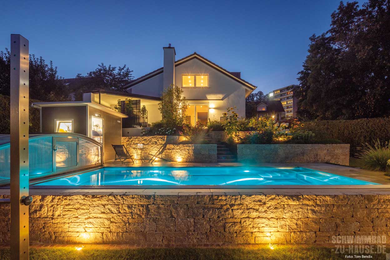 Landschaftsgärtner Bernd Hopp von der Hopp Garten GmbH in Offenburg überzeugte die Bauherren von der Idee, den kompletten Garten terrassenartig auf drei Ebenen anzulegen mit dem Schwimmbad in der Mitte. Was das Lichtkonzept und die Auswahl der Materialien anbelangt, holten sich die Eheleute Anregungen durch eigene Online-Recherche, bis sich die Vorstellungen konkretisierten: Gewünscht war ein elegantes Edelstahl-Schwimmbad als Herzstück einer mediterran gestalteten Poolebene mit terrassierenden Mauern aus Muschelkalk.