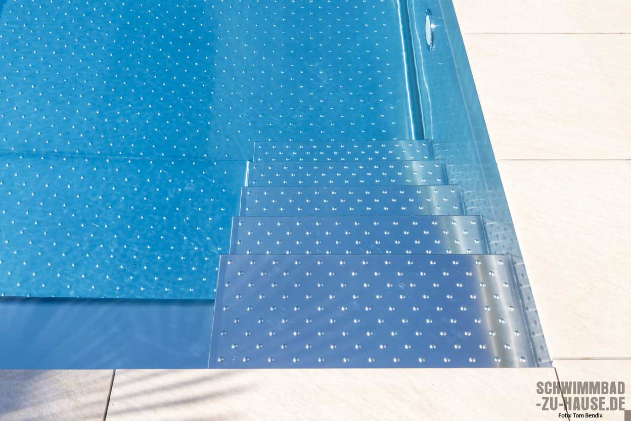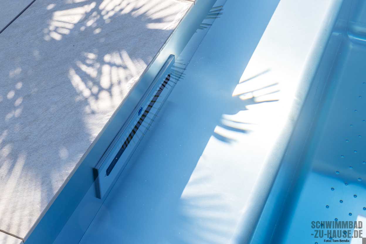 Das von der sopra entwickelte High-Level-System, eine Kombination aus Überlaufschacht und speziellem Skimmer, verleiht dem Edelstahlpool ein besonderes Flair: Der Wasserspiegel liegt nur rund 3 cm unter der Beckenoberkante, wodurch die Badenden einen ungehinderten Blick in den Garten genießen können. Ein Wellenreflexionsrand gewährleistet die maximale Wasserhöhe. Das 7,5 x 3,5 Meter große Becken mit Rutschsicherung und Sondernoppung wurde komplett bei der Firma Gassner gefertigt und in einem Stück