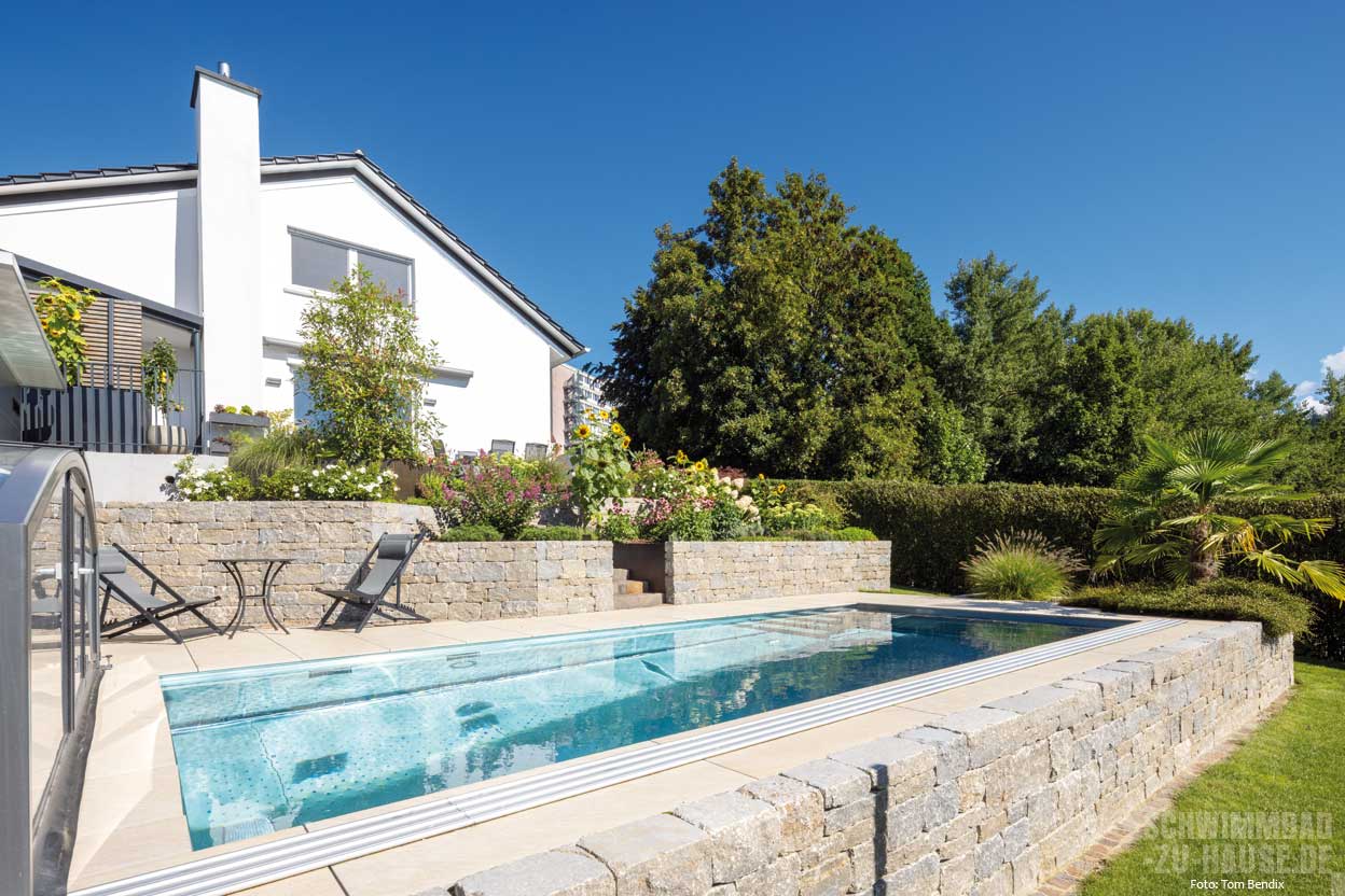 Sportliches Schwimmen mit der Gegenstromanlage, Aquabiking, fröhliches Planschen mit den Kindern, mediterranes Lebensgefühl genießen oder entspannt auf der Sitzbank im Wasser relaxen: Der Pool wird von der Familie vielfältig genutzt und erfüllt all ihre Wünsche – also alles richtig gemacht! Das sieht auch Schwimmbadbauer Steffen Henne so, der potenziellen Interessenten rät: „Bauen Sie lieber erst in ein paar Jahren, als sich mit einer Zwischenlösung zufrieden zu geben, die Sie nicht 100 Prozent glücklich macht.“