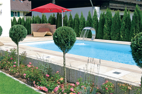 Der Bauherr Uwe Scheller wollte ein Schwimmbecken mit wenig Schnickschnack. Das kongruente Ziel der beiden Partner war es vor allem, ein stimmiges Gesamtbild zu schaffen. Dieses Ziel wurde mit einer linearen Beckenform und viele Liebe bei der Gartengestaltung erreicht. Die klaren Linien des PVC-Beckens werden dabei kontrastreich durch die kunstvoll gestalteten Sträucher, Bäumchen und Blumen in Szene gesetzt. Das Schwimmbad selbst ist mit einer dezenten Einstiegstreppe versehen, am Beckenrand findet sich ein Nackenschwall aus Edelstahl. Sonst ist das Becken frei von jeglichem Beiwerk. Doch die Schlichtheit dieses Pools ist nur optischer Natur, die Technik dahinter ist vom Feinsten.