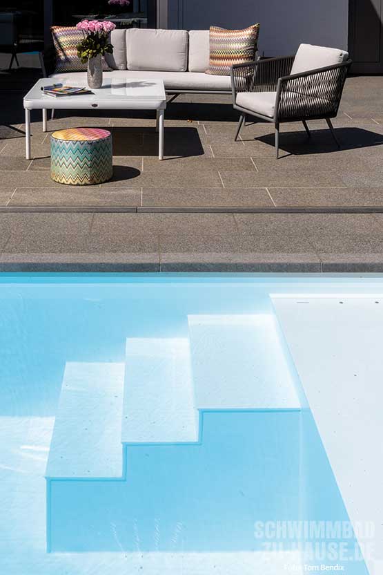 Die Beckenwahl fiel auf einen „SSF Pool One“, der durch seine minimalistische Geradlinigkeit gefällt und damit sehr gut zum Haus passt. Der Pool besteht aus dem High-Performance-Material Polystone, das pflegeleicht, stabil, widerstandsfähig und dadurch besonders langlebig ist. Auch nach Jahren der Nutzung behält es dank seiner speziellen Oberflächenstruktur seine optische Schönheit. Für eine nahtlose Verbindung zwischen Pool und Terrasse wurde die Beckenumrandung mit den gleichen grauen Natursteinfliesen gestaltet, die bereits auf der angrenzenden Terrasse verwendet wurden.