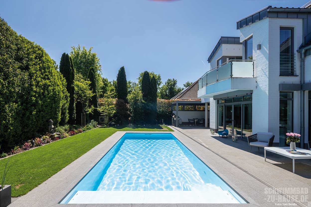 Ein kompakter Garten wandelte sich bei diesem Projekt durch den nachträglichen Einbau eines SSF-Pools zum Wellnessparadies. Auch sportliches Schwimmtraining ist in der eleganten Anlage möglich. Jetzt stellt der Pool das Zentrum des Außenbereichs dar – als wäre er schon immer da gewesen.
