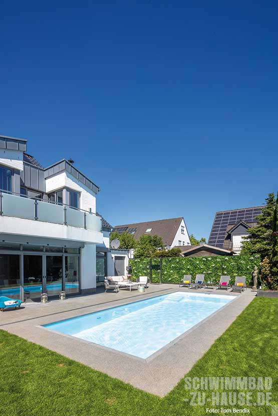 Zudem weiß der SSF-Pool mit hohem Komfort und moderner Technik zu überzeugen. Die vollautomatisierte SSF Premium-Technik zur Wasseraufbereitung mit freiem Chlor wurde anwenderoptimiert im Technikraum im Keller des Hauses untergebracht und garantiert kristallklares Wasser und eine hygienische Umgebung für ungetrübte Schwimmfreuden. Auch in Sachen Energieeffizienz präsentiert sich die Poolanlage up to date. Eine Schwimmbad-Wärmepumpe, die Energie aus der Umgebungsluft gewinnt, bringt das Wasser auf die gewünschte Temperatur. Der integrierte Rollladen verhindert bei Nichtnutzung des Beckens ein zu schnelles Auskühlen des Wassers und schützt den Pool vor Verunreinigung.