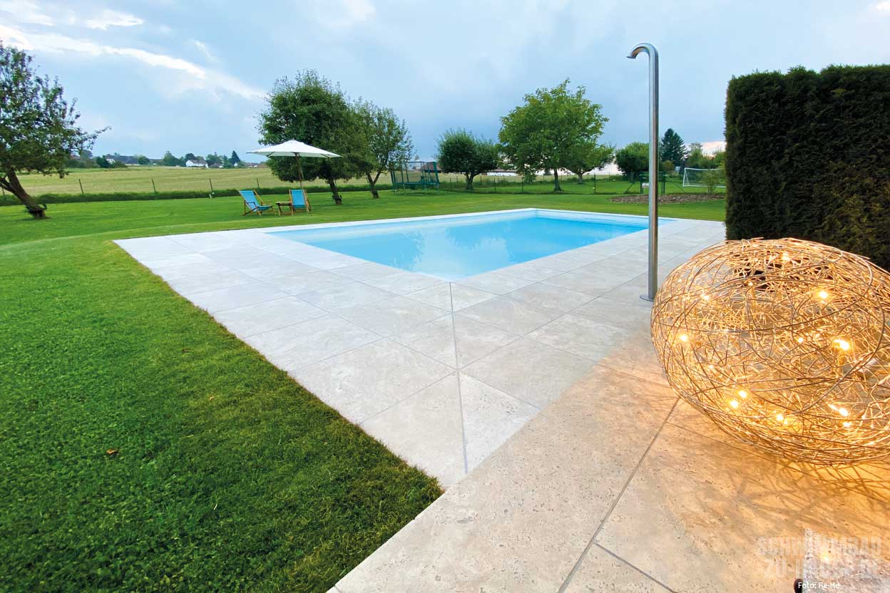 Auch die Ausstattung des Pools ist vom Feinsten – von den zwei Skimmern bis hin zur leistungsstarken Turbinenschwimmanlage HydroStar mit flachem Turbinenschacht, die für einen unglaublichen Volumenstrom sorgt und somit ein unvergleichliches Schwimmvergnügen. Zudem sind zwei Unterwasserscheinwerfer in den Pool eingebaut, die bei Dunkelheit ein buntes Farblicht-Spiel auf das Wasser und die Terrasse zaubern. Eine Einstiegstreppe und eine Sitzbank inklusive Massageanlage sorgen für zusätzliche Entspannung und Erholung im Pool. Und wenn es darum geht, den Pool sauber,