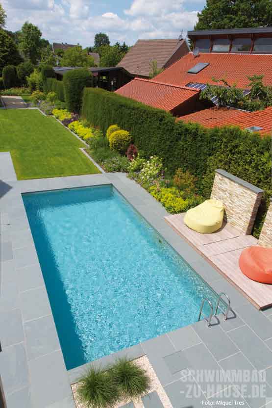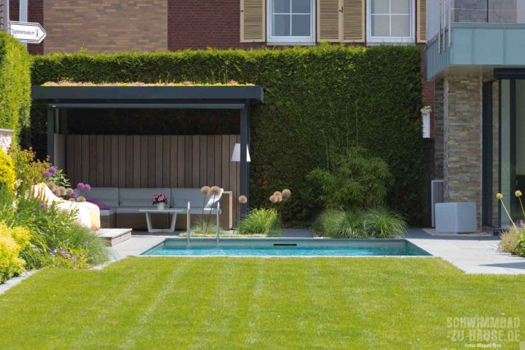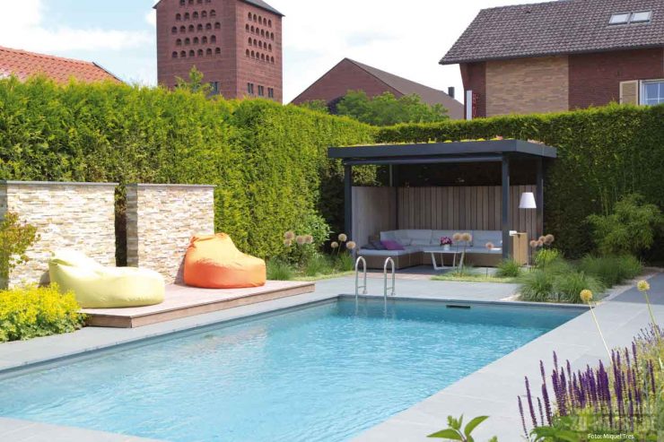 In enger Zusammenarbeit mit Michael Daldrup entstand so eine Paradies, das seinesgleichen sucht. Wo das Auge hinblickt, strukturieren geometrische und stringent geradlinige Formen jetzt das Erscheinungsbild des Gartens. Größtes gestalterisches Highlight in dem Ensemble aus Rasen, Terrasse, überdachtem Loungebereich mit gemütlichen Möbeln, etlichen Blumenbeeten und kubischen Designelementen ist ohne Frage der 8,00 x 4,00 Meter große rechteckige Naturpool am Rand des Grundstücks. Das mit Folie ausgekleidete Becken ist von großformatigen hellgrauen Natursteinfliesen umrandet, sodass ein ästhetischer Kontrast zum hellblauen Badewasser entsteht. Während die eine Längsseite des Pools zum Garten hin offen ist, schützt auf der anderen Längsseite eine hohe üppige Hecke vor ungewollten Blicken. So können die Bauherren zu jeder Tageszeit in völliger Ruhe im Becken ihre Schwimmbahnen ziehen.