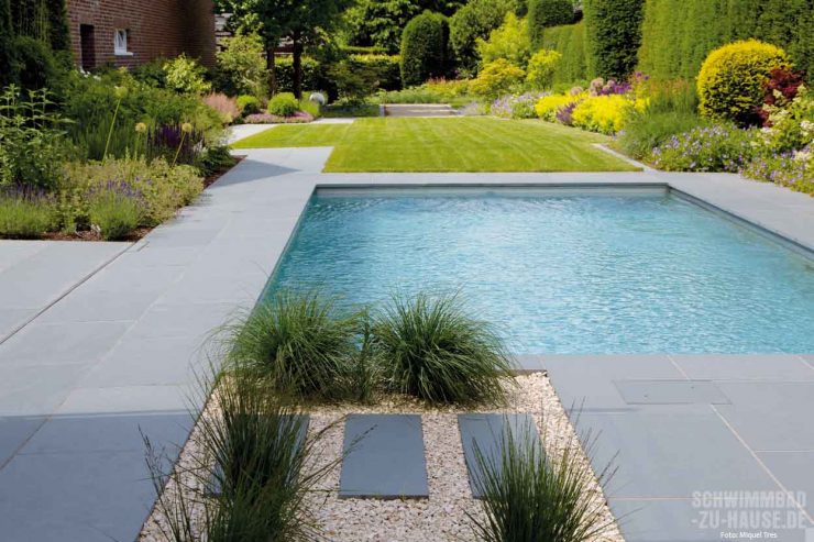Terrassentür auf, einige Schritte in den Garten setzen und schon betreten die Bauherren im Münsterland eine neue Welt. Eine Welt mit geordneter, geradliniger Formensprache, mit viel Grün, vielen Pflanzen und mit verschiedenen Sitz- und Loungemöglichkeiten, eine Welt voller Natur und Ruhe. Im Zentrum dieser natürlichen Wellnessoase lädt ein Naturpool und das kristallklare, hellblaue Wasser im Becken zum erfrischenden Sprung ins kühle Nass ein. In den warmen Monaten des Jahres spielt sich genau hier das Leben ab, im Wohngarten, der alles bietet, was man für die Entspannung zu Hause benötigt.