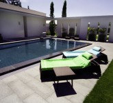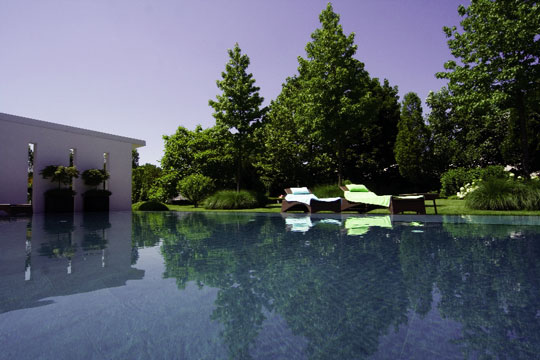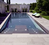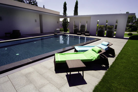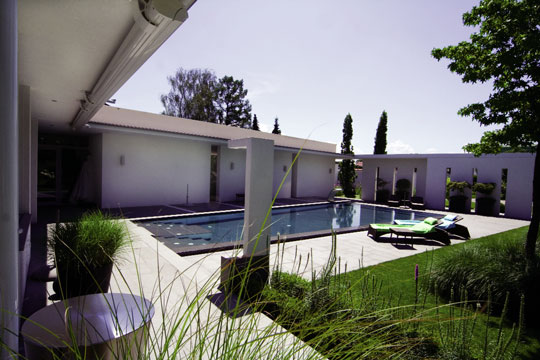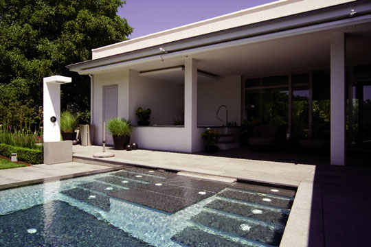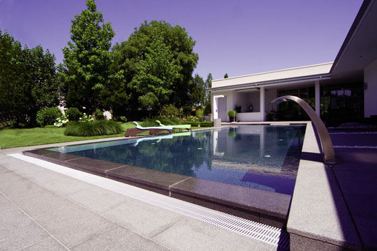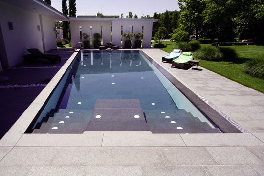 Voraussetzung dafür waren gute Planung im Vorfeld und perfekte Technik, damit der Betrieb des Schwimmbads möglichst einfach ist. Technisch wird die gesamte Anlage von einer Zentralsteuerung mit Touchpad betrieben und überwacht. Ein Reinigungssystem mit Bodendüsen reinigt nahezu selbstständig den Boden und sorgt so für ein sauberes Schwimmbad. Nach der Reinigung im Sandfilter wird die Wasseraufbereitung von einer Dosiertechnik für pH-Wert und Chlor übernommen. Die optische Krönung der Außenanlage ist unumstritten die Verkleidung von Beckenboden, Treppe und Überlauf mit dunklem Granit, doch das Schwimmbad bietet auch technische Glanzpunkte.