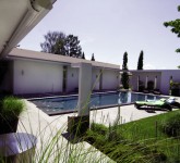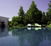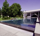 Das gesamte Schwimmbad wird von einer Zentralsteuerung mit Touchpad betrieben und überwacht. Ein Reinigungssystem mit Bodendüsen reinigt nahezu selbstständig den Boden und sorgt so für ein sauberes Schwimmbad. Eine Rollladenabdeckung verlängert die Badesaison dank ihrer wärmedämmenden Funktion und Hausherr Theo Mayer kann sich bis in die frühen Herbstmonate an dem geheimnisvoll-dunklen Schimmern seines Granitpools erfreuen. Die Anlage verfügt über ein Nachtabsenkungsprogramm: Dabei wird bei geschlossener Abdeckung der Überlauf deaktiviert. So wird die Abkühlung größtenteils verhindert und man erspart sich das teure und unnötige Heizen über Nacht.