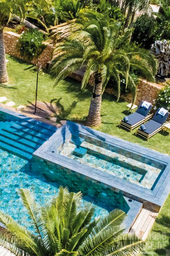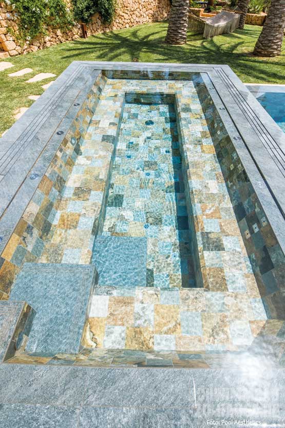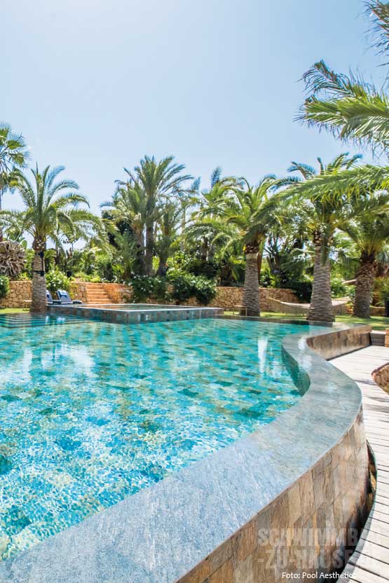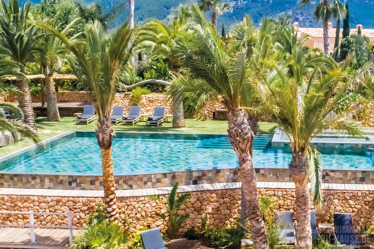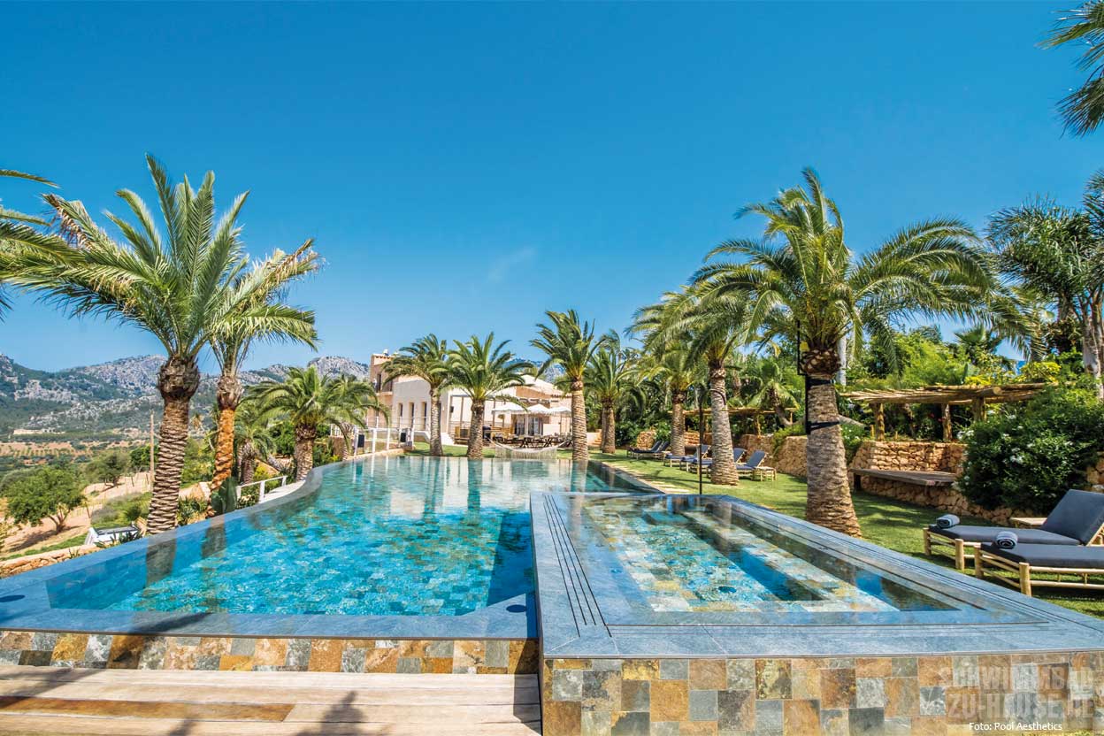 Die Wellnessanlage dieser Finca im Hinterland von Mallorca könnte genauso gut ein Fünf-Sterne-Resort zieren. Wie aus einem Hotelprospekt wirkt die grüne, von Palmen umsäumte Oase mit Whirl- und Swimmingpool, Wasserattraktionen und einer hochmodernen Technikausstattung. Das außergewöhnliche Becken bietet alle Möglichkeiten für sportliches Schwimmen, Wasserspaß und Entspannung auf allerhöchstem Niveau.