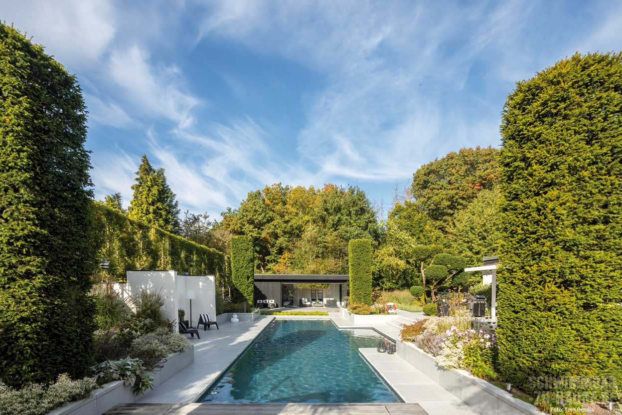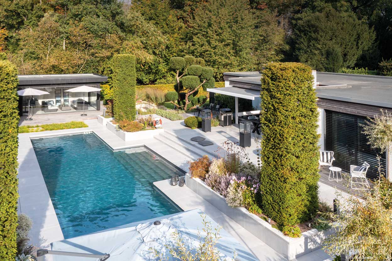 Das Paar vertraute komplett auf Herrn Terpelles Expertise und ließ ihm freie Hand bei der Gestaltung des Pools und auch des gesamten Gartens. Terpelle und sein Team arbeiteten professionell und effizient und sorgten dafür, dass das Projekt reibungslos verlief. Das Ergebnis kann sich sehen lassen: ein traumhafter Pool, gemütliche Sitzgelegenheiten in jeder Ecke, eine Feuerstelle und ein Poolhaus zur Erholung. Allesamt perfekt integriert in den durchdachten Garten.