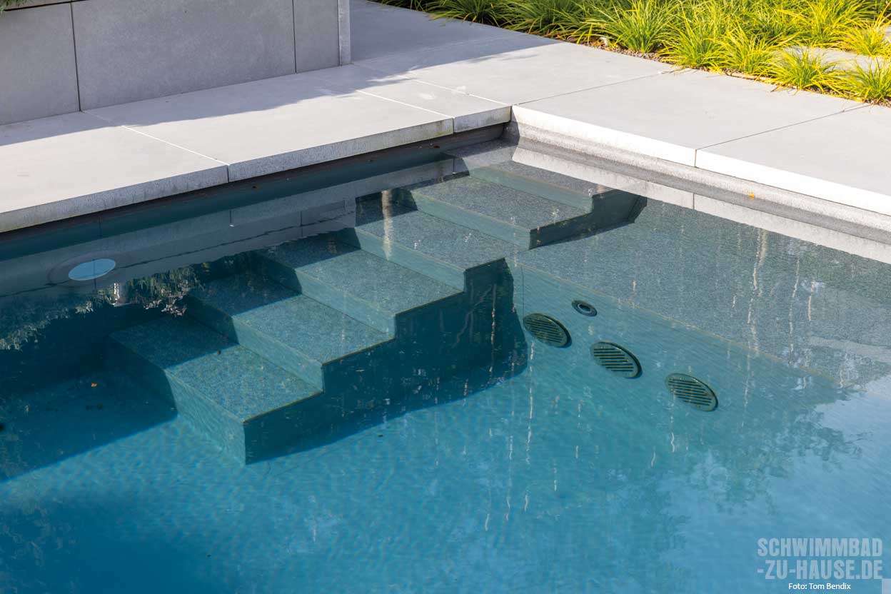 Das fertige Terpelle-Betonbecken ist ausgestattet mit einer Gegenstromanlage und Massagedüsen. Rolladen und Heizung sorgen für die richtige Badetemperatur und auch an eine ambiente Beleuchtung für entspannte Abendstunden hat das Terpelle Team gedacht.