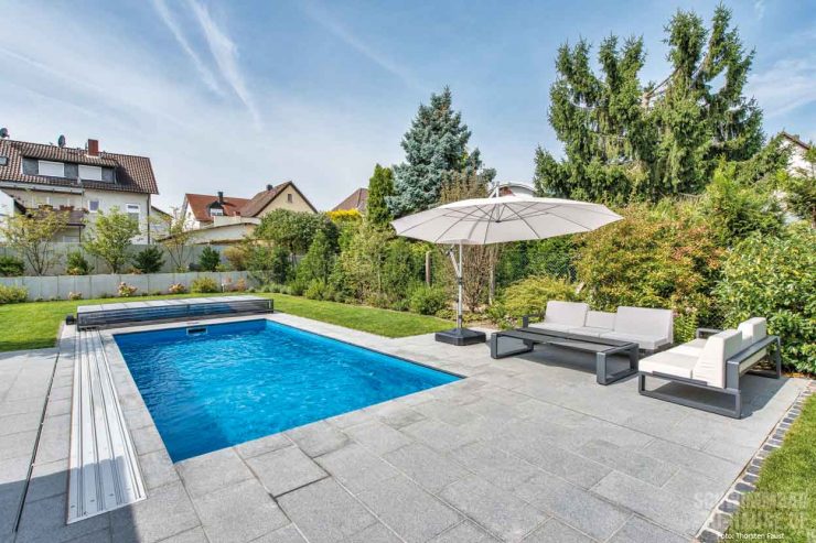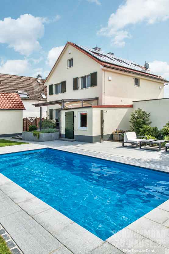 „Wir haben uns zwei Jahre Zeit für die Planung gelassen und immer wieder neue Entwürfe angefertigt, bis feststand: So sollen das Schwimmbad und die Umgebung aussehen. Erst dann sind wir mit unseren Plänen an die Firma Pool-Konzept, die wir in der Ausstellung in Haibach kennenlernten, sowie den Garten- und Landschaftsbauer herangetreten“, erinnern sich die Eheleute. Bei Gestaltung und Technik des gewünschten klassischen Pools gab es für das erfahrene Team von Pool-Konzept einige Aspekte zu beachten: Die Positionierung des Beckens sollte ein Maximum an Sonnenlicht aufweisen, eine hochwertige Poolüberdachung, die Schmutz fernhält und Wärmeverlusten vorbeugt, eine nachhaltige Heizung via Solaranlage, möglichst geringer Pflegeaufwand und eine einfache Bedienung durch den Anschluss der Schwimmbadtechnik an die KNX-Haussteuerung.