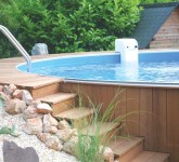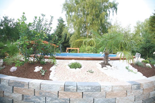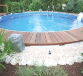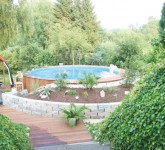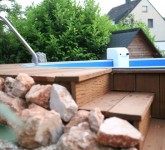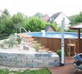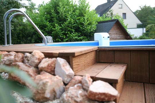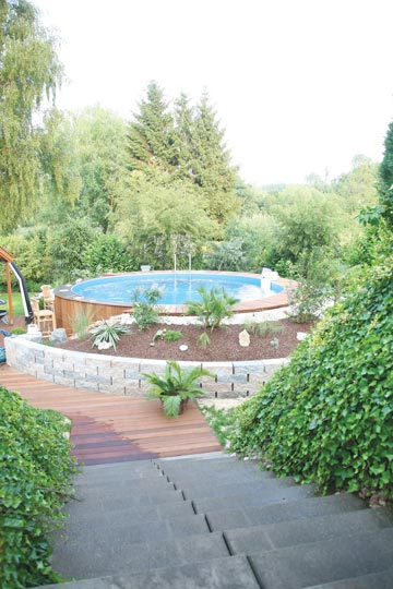 Es besteht aus einer 1 mm starken Wand aus kunststoffbeschichteter Aluminiumlegierung, UV-stabilisierter Einlegefolie und Aluminiumhandlauf, gold oder silbern eloxiert. Hohen Technikkomfort bekam die Anlage durch eine Mineralsalz-Elektrolyseanlage, eine Glasfilteranlage und einen vollautomatischen Bodenabsauger – bereits in der Planung. Jetzt gab es nur noch ein kleines Problem zu lösen: Bedingt durch die Grundwassersituation vor Ort konnte der Pool nicht eingelassen werden. So wurde eine attraktive Lösung für ein oberirdisches Aufstellen des Beckens plötzlich zum Thema. Die kreativen Poolspezialisten entwarfen eine Umbauung des Pools mit Bangkirai, die vom Bauherren aufgenommen und selbst umgesetzt wurde. Und mit dieser Lösung ist die ganze Familie nun rundum glücklich.