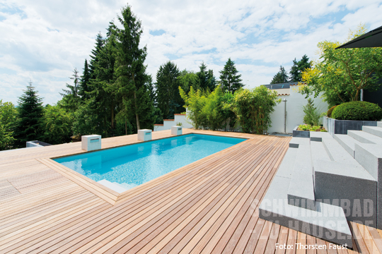 Um diesen neuen Pool dezent einzubetten, wählte der Fachmann eine hellgraue Folienfarbe, die das Wasser nicht allzu hell und dennoch natürlich wirken lässt. So hebt sich das klare Wasser um einige Nuancen von dem restlichen Ambiente ab, ohne aufdringlich ins Auge zu fallen. Gleichzeitig ummantelt eine naturbelassene, helle Poolumrandung aus Cumaruholz den gesamten  Betonkörper des neuen Beckens, sodass Schwimmbereich und Garten eins zu werden scheinen. Camaru ist eine spezielle Holzart aus Mittelamerika, die aufgrund ihrer Resistenz gegen Feuchtigkeit für den Nassbereich sehr geeignet ist.