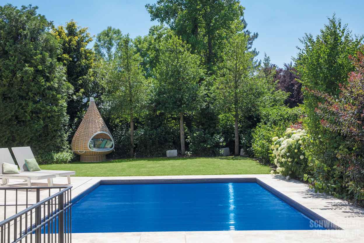 Als waschechte Wasserratten könnte man die beiden Kinder der Bauherren aus Grünwald bezeichnen. Mit ihren sechs und acht Jahren gibt es für sie kaum etwas Spannenderes, als sich stundenlang beim Schwimmen, Spielen und Planschen im kühlen Nass aufzuhalten – unabhängig davon, ob es Sommer oder Winter ist. Da der Wunsch der beiden Jüngsten nach einem Pool so groß war, entschieden sich die Bauherren mit schönem Grundstück hinter dem Haus daher für ein Schwimmbecken im heimischen Garten. „Inspirationen für die Gestaltung sowie Technik holten wir uns hierbei im Showgarten der Firma Riviera Pool im Hofquartier in Taufkirchen bei München“, erzählen die beiden im exklusiven Interview mit haus+wellness*.