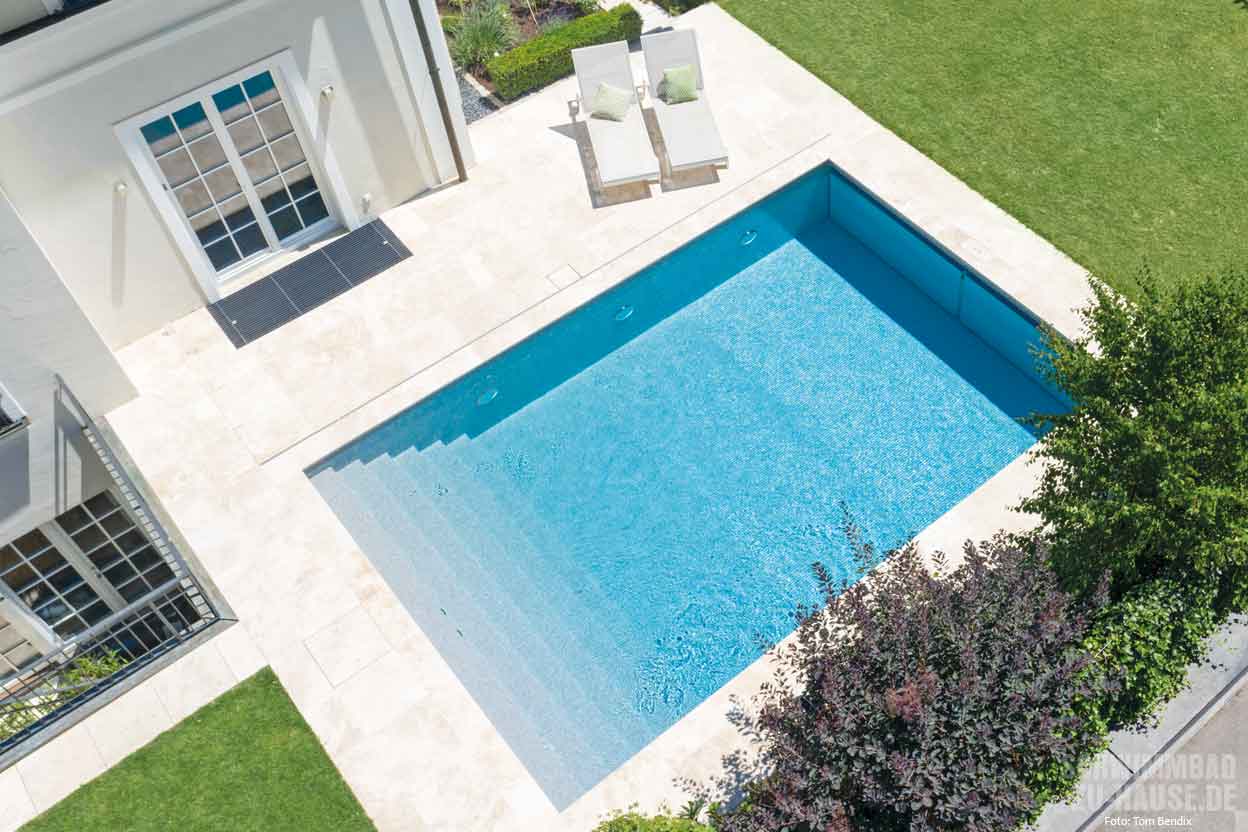 Fest stand, dass man sich ein maßgefertigtes Becken wünschte, das sich optisch und von den Proportionen her harmonisch in die dafür vorgesehene Stelle im Garten positioniert. „Eine Mosaikauskleidung des Beckens zählte darüber hinaus absolut zu unseren Favoriten“, schwärmt das Ehepaar. Für die exakte Planung sowie die Umsetzung des Projekts bedurfte es fachmännischer Hilfe – und so fiel die Wahl auf Franz Steinbauer und sein erfahrenes Team aus Miltach. „Passend zu den vorhandenen Bodenplatten im Garten hat das Ehepaar sowohl die Größe des Pools als auch die Farbe des Mosaiks im Becken bestimmt“, erinnert sich Schwimmbadbauer Franz Steinbauer an konkrete Wünsche. Entstanden ist ein Bade- und Wellnessparadies mit modernem Charakter, das dem Garten der Familie den letzten Feinschliff gibt.