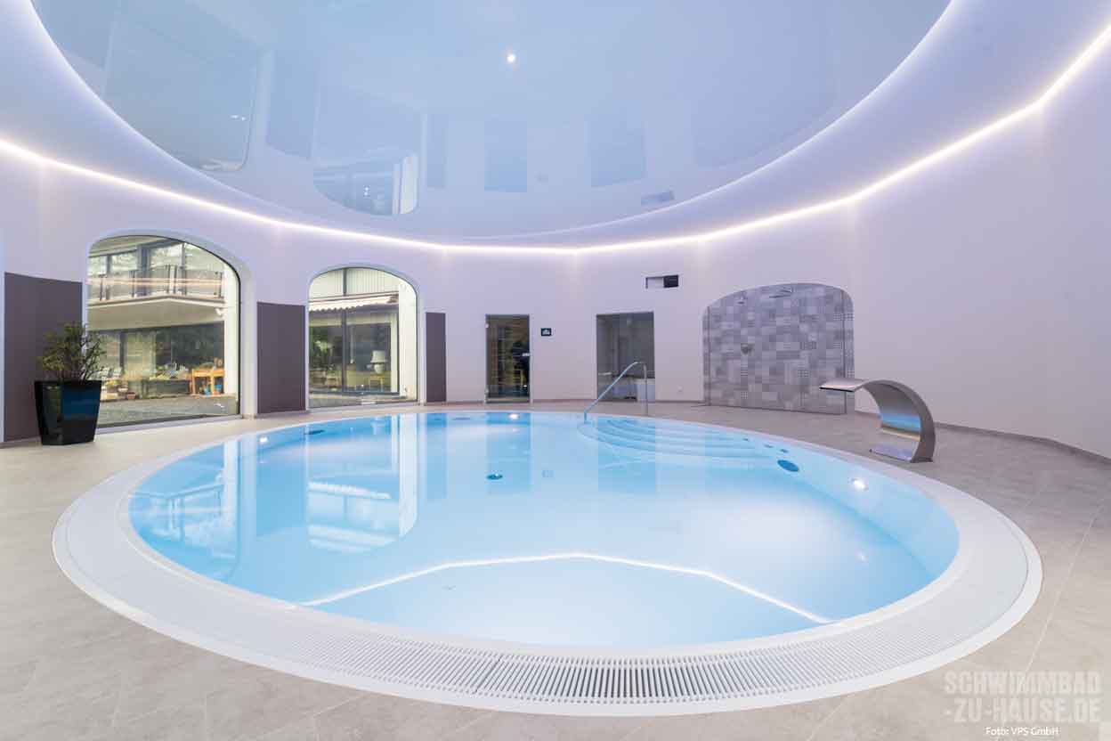 Sanfte und klare Formen prägen die Kölner Villa, deren Architektur mit einer weitläufigen Schwimmhalle abgerundet wird. Die Sonne scheint durch die großen Fenster nach Süden und setzt das ovale Schwimmbecken in Szene. „Der Korpus der Schwimmhalle fügt sich als runder Anbau nahtlos dem bestehenden Haus an“, berichtet Ralf Selle, Geschäftsführer des Projektbeteiligten Beckenhersteller Vario Pool Systems. Denn die ovale Form, die zum Gebäude passt, war ein besonderer Wunsch des Bauherrn und seiner Frau. Keine leichte Aufgabe für die Poolprofis. Deshalb holte SSF-Projektleiter Horst Müller die Experten von VPS mit ins Boot, zu deren Spezialgebiet individuelle und exklusive