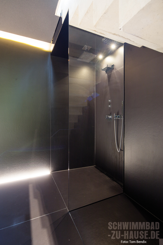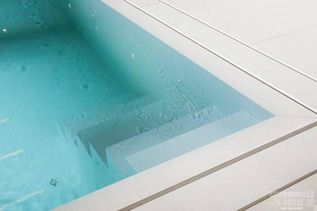 In der Folge kam es dann zu einem Treffen zwischen Ehepaar Schmidt, den Architekten und Hesselbach-Mitarbeitern. Neben den bautechnischen Aspekten, wie Wärmedampfsperre und Einsetzen des PVC-Beckens von VPS, wurden natürlich auch die einzelnen Wellnesskomponenten besprochen und für das Projekt zusammengestellt. Danach setzten alle Beteiligten Unternehmen ohne kleinere und größere Zwischenfälle die Pläne schnell um. Um den sportlichen Charakter des 9 x 3 x 1,40 Meter großen Pools zu verstärken, entschloss man sich, eine Ospa-Gegenstromanlage zu installieren. Für das optische Highlight sollte eine spezielle Überlaufrinne aus Naturstein sorgen. Damit sich das Ehepaar nicht nur beim Bau, sondern auch beim Betrieb nicht mit den Wellness-Komponenten auseinandersetzen musste, wurde eine vollautomatisierte Wasseraufbereitung gewählt. Dabei wird das Wasser mit einer Speck-Pumpe in Bewegung gehalten und von Lahme-Scheinwerfern glasklar in Szene gesetzt.