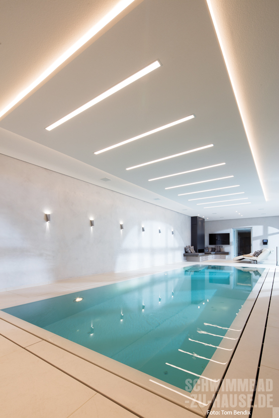 Die sportbewussten Bauherren hatten bereits Erfahrungen mit einem privaten Schwimmbad. Auch in ihrem neuen Anwesen wollten sie nicht auf Fitness & Wellness zu Hause verzichten und entschlossen sich deshalb, die neue Sport- und Spa-Welt noch ein bisschen großzügiger zu gestalten. Mithilfe erfahrener Profis können sie heute Belastung und Regeneration verbinden, denn im Haus steht ihnen nun nicht nur ein elegantes Hallenbad, sondern auch eine Sauna zur Verfügung.