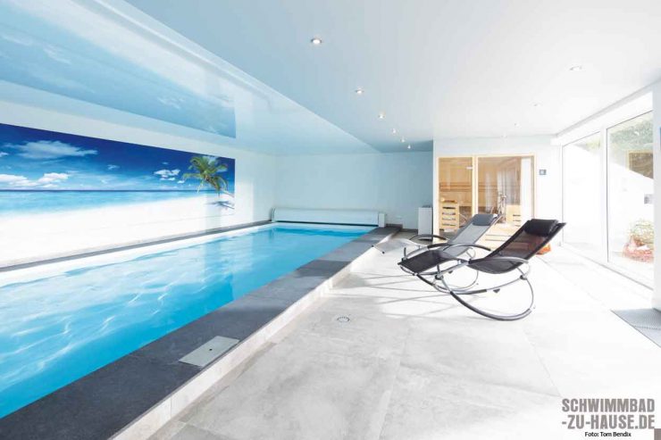 Als großer Wasserfan, der schon immer den immensen Spaßfaktor beim Baden genoss, wünschte sich der Bauherr ein eher längliches Becken. Hier wollte er den Alltag ausblenden und sich in der Privatsphäre seiner eigenen vier Wände entspannen. In Absprache mit den Fachleuchten entschied man sich daher, das zuvor 10 x 6 Meter große Becken auf 10 x 3,3 Meter zu verkleinern. Über eine seitlich ins Becken integrierte Einstiegstreppe gelangen die Bauherren sicher ins Wasser, die komplette Länge des Beckens kann so als Schwimmfläche genutzt werden. „Durch die Verkleinerung des Beckens haben wir nun mehr Platz und der gesamte Raum wirkt offener“, schwärmt das Ehepaar. Ergänzt wird dieser Effekt durch den parallel zur Beckenlänge verlaufenden Kunstdruck mit tropischem Motiv, das das Blau des Pools harmonisch aufgreift und den Raum gestalterisch öffnet. Diese geradlinige Formensprache zieht sich stringent durch den gesamten Raum: von der Spannlackdecke über dem Becken und die linear angeordneten Lichtelemente bis hin zur maßgefertigten Saunakabine in der Nähe der bodentiefen Fensterfront.