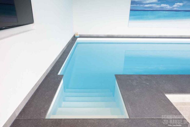 Als großer Wasserfan, der schon immer den immensen Spaßfaktor beim Baden genoss, wünschte sich der Bauherr ein eher längliches Becken. Hier wollte er den Alltag ausblenden und sich in der Privatsphäre seiner eigenen vier Wände entspannen. In Absprache mit den Fachleuchten entschied man sich daher, das zuvor 10 x 6 Meter große Becken auf 10 x 3,3 Meter zu verkleinern. Über eine seitlich ins Becken integrierte Einstiegstreppe gelangen die Bauherren sicher ins Wasser, die komplette Länge des Beckens kann so als Schwimmfläche genutzt werden. „Durch die Verkleinerung des Beckens haben wir nun mehr Platz und der gesamte Raum wirkt offener“, schwärmt das Ehepaar. Ergänzt wird dieser Effekt durch den parallel zur Beckenlänge verlaufenden Kunstdruck mit tropischem Motiv, das das Blau des Pools harmonisch aufgreift und den Raum gestalterisch öffnet. Diese geradlinige Formensprache zieht sich stringent durch den gesamten Raum: von der Spannlackdecke über dem Becken und die linear angeordneten Lichtelemente bis hin zur maßgefertigten Saunakabine in der Nähe der bodentiefen Fensterfront.