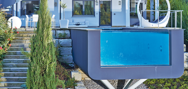 Dieses Streben nach mee(h)r, unter dem die Planung des Projekts stand, findet sich auch in der Poolgestaltung wieder. Der Betonkorpus ist mit feinem, hellblauem Glasmosaik ausgekleidet – eine gute Wahl für einen sich so stolz hervorreckenden Pool. Ein besonderes Augenmerk gilt der Front, ein dicker Glasabschluss (bestehend aus drei einzelnen Glasscheiben) gibt beim Schwimmen und beim Tauchen den Blick auf den Garten sowie die Umgebung frei. Bei einer solch schwierigen Konstruktion liegt die Wahrscheinlichkeit, dass beim Bau etwaige Probleme auftreten, natürlich etwas höher – wie hier geschehen. Die Abdichtung im Rahmen des Fensterelements war undicht und musste neu geplant und ausgeführt werden. Nun sind die Probleme allerdings verlässlich gelöst. Eine elegante Lösung finden wir am anderen Ende des Beckens. Es wurde ein Art integrierte Überlaufrinne konzipiert, kombiniert mit einer Rucksacklösung für die Rollladenabdeckung. Dieser Bereich ist mit drei stabilen Milchglasplatten abgedeckt – so hat man einerseits einen leichten  Zugriff auf die Technik und trotzdem eine optisch ansprechende und passende Lösung zum Look des Pools gefunden.