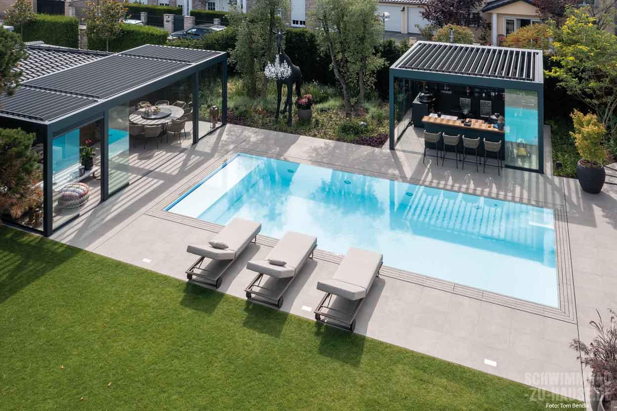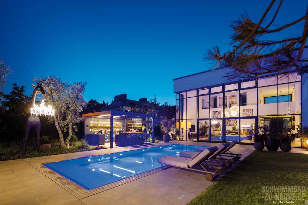 Ein besonderes Augenmerk liegt dabei selbstverständlich auf der voll ausgestatteten Outdoor-Küche, die es den Auftraggebern ermöglicht, Freunde und Bekannte an lauen Sommerabenden zu einem geselligen Abendessen einzuladen – dank der hochwertigen Gerätschaften dürfte hier kein kulinarischer Wunsch unerfüllt bleiben. Mit Familie und Freunden eine gute Zeit zu haben, war im Übrigen auch ein Grund für die Anschaffung des Swimmingpools – und das ist dank der großzügigen Maße von 10,00 x 4,00 Meter auch ausgiebig möglich. Das Becken, das von Vario Pool Systems stammt, wurde mit einer ganzen Reihe an Wasserattraktionen ausgestattet, darunter eine Flachwasserzone sowie eine leistungsstarke