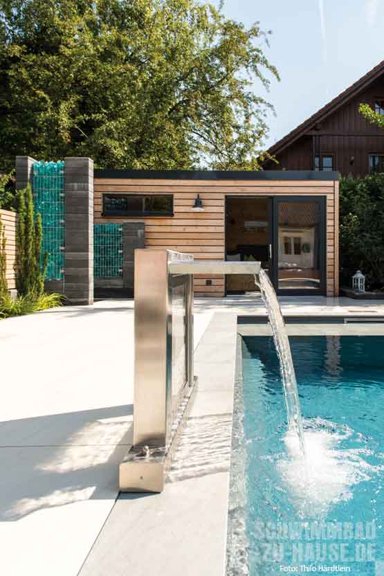 Mit den Maßen 8,30 x 3,80 x 1,50 Meter ist das Schwimmbad eher kompakt – und fügt sich doch dezent in die Umgebung ein. Damit der Pool dennoch für das tägliche Schwimmtraining genutzt werden kann, montierte das Profiteam von Reps eine leistungsstarke Gegenstromanlage an der Stirnseite des Beckens. Ergänzt wird diese Wasserattraktion durch die sich mittig am Beckenrand befindende Schwalldusche „Aquarius“ aus Edelstahl. Sie sorgt für sanfte Rückenmassagen und fasziniert gleichzeitig – dank ihrer LED-RGB-Leuchten – bei Dämmerung und in der Nacht durch stimmungsvolles Licht.