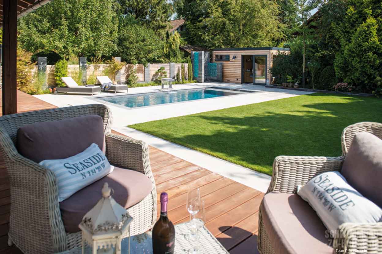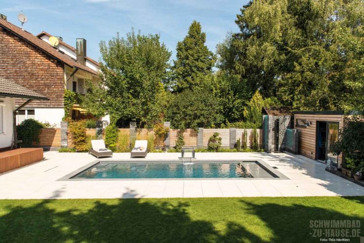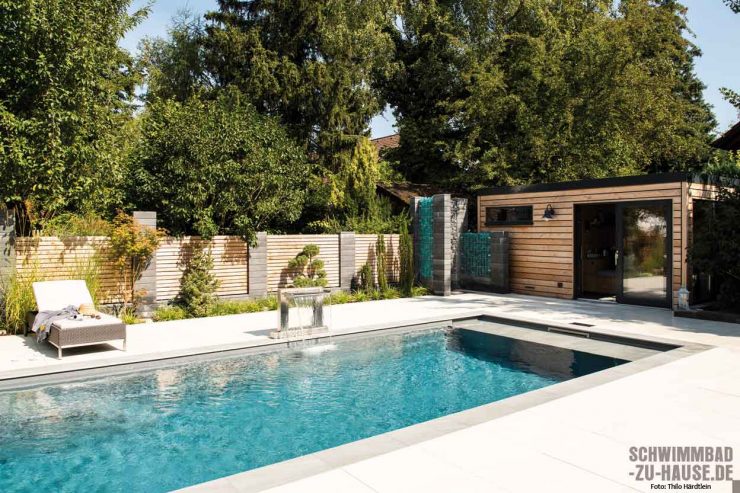 Funkelnd türkis und die einfallenden Sonnenstrahlen reflektierend lockt das kristallklare Wasser die gesamte Bauherrenfamilie dieses perfekt konzipierten Wellnessgartens im Norden Münchens zu jeder Jahres- und Tageszeit in den Pool. Lange Jahre träumten der Diplom-Ingenieur und seine Frau davon, zu Hause und in vollkommener Privatsphäre entspannen zu können. Fleißig wurden im Internet Ideen gesammelt, bis die Pläne immer konkreter wurden und es schließlich Ende des vergangenen Jahres für finale Anregungen auf die Messe „Heim und Handwerk“ ging: Hier lernten die Bauherren die Schwimmbadprofis der Reps GmbH kennen. Die Chemie untereinander stimmte auf Anhieb. Erste Details zum geplanten Poolprojekt wurden bereits direkt vor Ort geklärt.