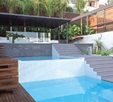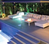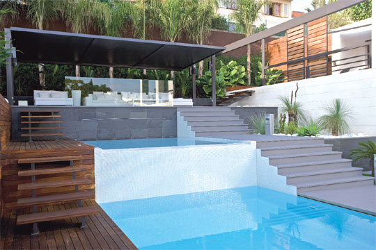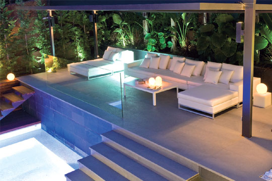 „Die Kunden wollten den Außenbereich in einen umweltfreundlichen Raum verwandeln, mit wenig Material sowie Pflanzen, die geringe Pflege erfordern“, erläutert die Gartenarchitektin, „Die Auswahl und Verteilung der Pflanzen soll Sichtschutz bieten.“ Am oberen Bereich schafft ein schwarzes Sonnendach und die darunter geschützten weißen Möbel eine Ruhezone. Dorthin gelangt man entweder über die – vom Beckenkopf aus gesehen – rechtsseitige granitfarben belegte Terrasse, die den Pool mit dem kubistischen Wohnhaus verbindet, oder linker Hand über das Holzsonnendeck. Vom strahlendweißen Loungesofa aus auf der ca. 4,5 m erhabenen Chill-out-Ebene können nun die stolzen Hausherren die beeindruckende Poolarchitektur bestaunen.