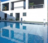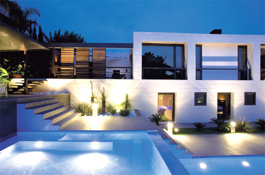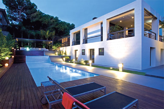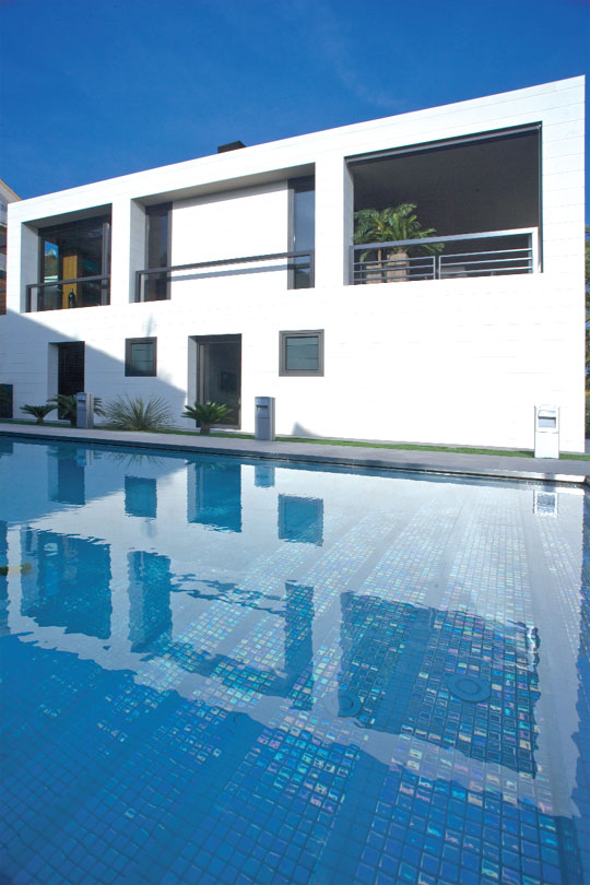 Juan und Mercedes Monzó (Name von der Redaktion geändert) gehören der Gruppe der „Stadtflüchtigen“ an, die sich ihr Domizil in Sant Just, nur ca. 10 km von Barcelona entfernt, eingerichtet haben. Ein bereits vorhandenes Gebäude aus traditionellen Ziegelsteinen wurde mittels einer Konstruktion aus weißen Fassaden und breiten Glasfronten, die den Kontakt nach draußen in den Vordergrund stellen, generalüberholt. Die Renovierung des Gartens und des alten vorhandenen Pools wurde parallel zum Hausumbau vorgenommen und ging Hand in Hand. Das alte Schwimmbad dient heute zum Teil der Unterbringung des Ausgleichsdepots des neuen Überlaufpools. Dieser ist das unbestrittene Highlight der Gartenanlage und er zieht sich über mehrere Ebenen hinweg. Das Hauptbecken verfügt über die Maße 13 x 4 m. Eine gemauerte Treppe entlang der Endkante des Pools stellt die Verbindung zum Sonnendeck her: „Es sollte eine Metalltreppe vermieden werden“, wie die ausführende Landschaftsarchitektin Paula Rodrigues erklärt. Im oberen Bereich wurde ein Whirlpool mit 4 x 4,5 m geschaffen, mit Rundumbänken und einer geringen Tiefe von 90 cm. Eine Zone, die den Chill-out-Bereich komplettiert und visuell in das Hauptbecken eingebunden ist, jedoch eigenen Charakter besitzt. Das Ebenen-Design sieht vor, die Strecken von Treppen und Mauern zu minimieren, die vorhandenen 4,5 m Höhenunterschied des Gartens werden so optisch aneinandergezurrt und gegliedert. Die Hauptrolle des Pools wird weiter durch einen 3 m breiten Wasserfall hervorgehoben, der sich über eine schiefergetäfelte Mauer wie ein Wasservorhang ergießt und den Höhenunterschied des Raumes verstärkt. Als weitere Barriere zeigt sich die Mauer, die Whirlpool und Schwimmbecken voneinander trennt: Sie wurde mit weißem Glasmosaik geschmückt.