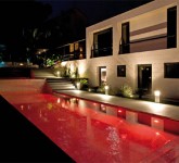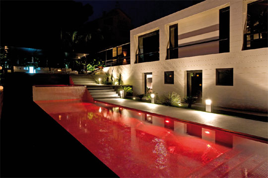Paula Rodrigues über ihr Pooldesign: „Es handelt sich um einen eingebauten Überlaufpool, es sollten aber die wenig ästhetischen Rundumkanäle mit Gittern vermieden und eine maximale Wasserhöhe erzielt werden.“ Ein vorgefertigter Betonkanal verläuft oberhalb des Spritzbetonbeckens und nimmt das Wasser auf. Ein L-förmiger Winkel aus Edelstahl, der auf kleinen Pfeilern steht, bildet den Überhang. Ist das Badewasser erst durch diese Schleuse gelangt, wird es in das Filter- und Aufbereitungssystem geleitet, das über Salzelektrolyse funktioniert. Zusätzlich verfügt der Pool über ein automatisches Bodenreinigungssystem. Boden, Wände und Treppe des Betonbeckens wurden mit elfenbeinfarbenen Glasmosaikplättchen belegt, deren Farbe so gewählt wurde, um die wechselnde Farbbeleuchtung zu potenzieren. Unterwasser-LED-Leuchten sorgen für die spezielle Beleuchtung, die durch die drei Grundfarben Rot, Blau und Grün gebildet wird. Durch Kombinationen ergibt sich die Möglichkeit, zwölf verschiedene Farben voller Helligkeit und Lebendigkeit zu erzielen.