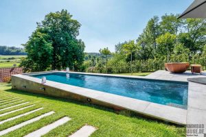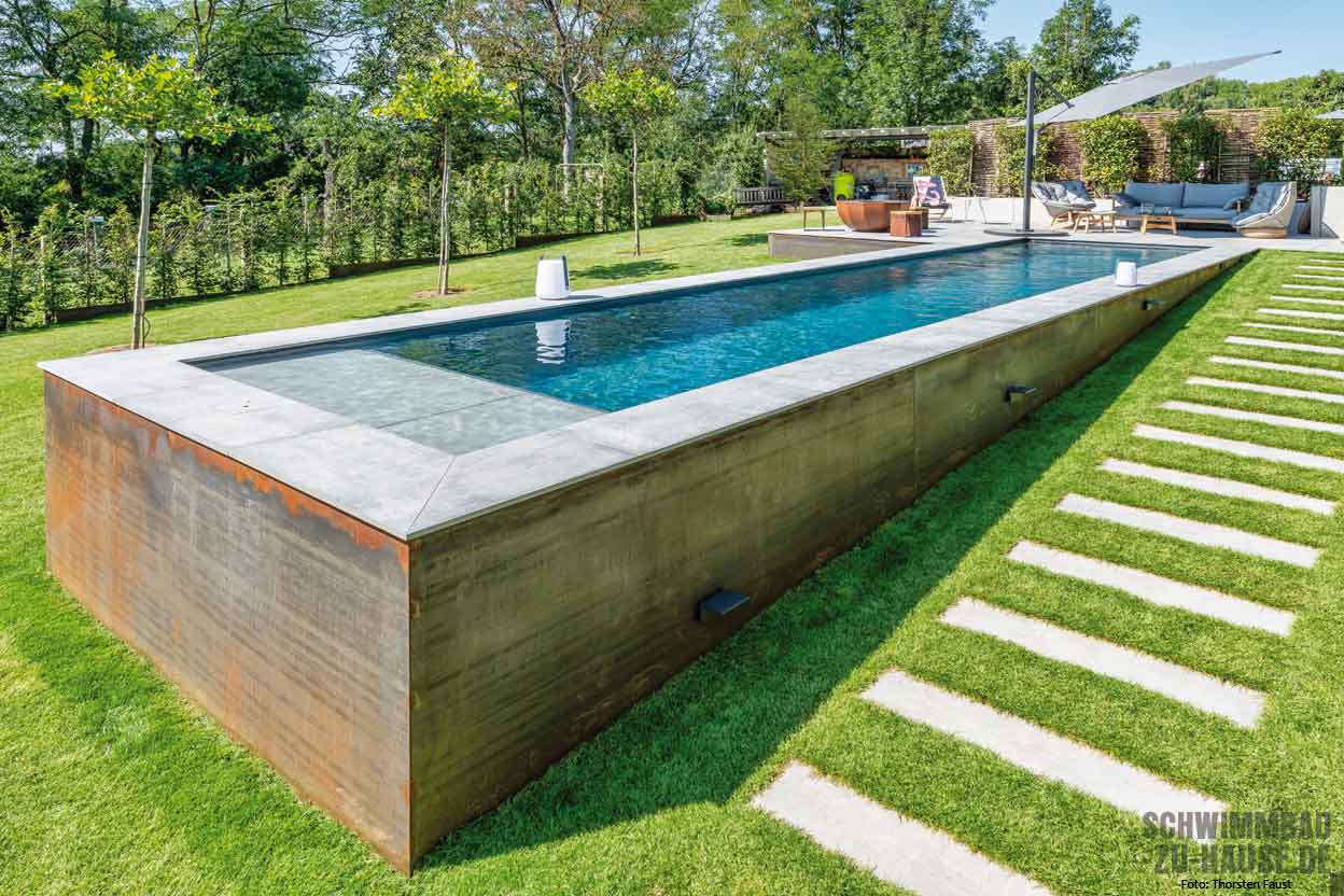 Als aktiver Triathlet träumte dieser Bauherr von einem eigenen Pool, in dem er sein tägliches Schwimmtraining absolvieren kann. Das Becken sollte möglichst lang sein und über eine leistungsstarke Gegenstromanlage verfügen, die den hohen Ansprüchen in Sachen Work-out gerecht wird. Auch optisch entschied man sich für eine außergewöhnliche Lösung: Der Pool ragt im wahrsten Sinne des Wortes aus dem Boden heraus und ist aufgrund seiner auffälligen Beckenverkleidung ein absoluter Eyecatcher.