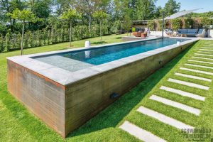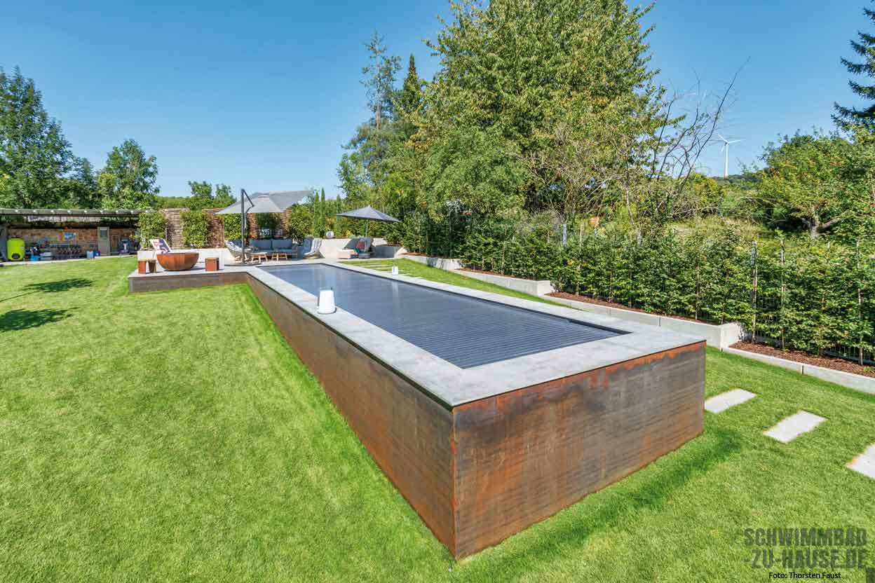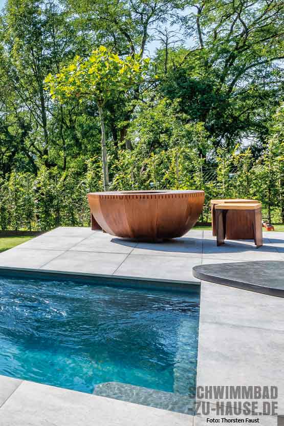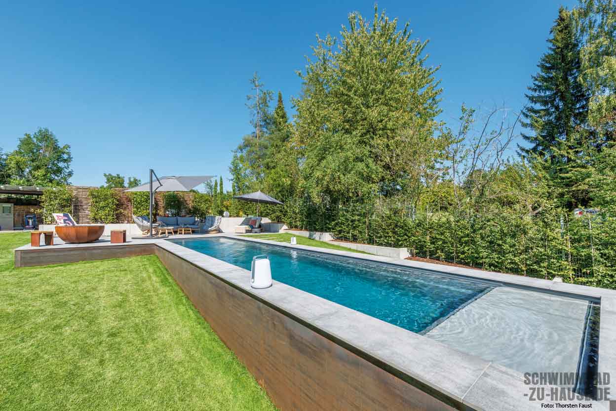 Was die Gestaltung betraf, übernahm der Bauherr größtenteils selbst die Regie: Das geradlinige Becken ist auf der einen Seite ebenerdig mit der dahinter liegenden Sonnenterrasse verbunden, während die andere Stirnseite aus dem Boden herausragend installiert worden ist. Hiermit arrangierte man sich zum einen mit der Hanglage des Gartens und setzte zum anderen ein optisch individuelles Statement. Auch bei der Verkleidung des Beckens bewiesen Bauherr und Team von Pool-Konzept Mut: rostfarbene Metallelemente, die einen coolen Look im modernen Industrial-Design hervorrufen. Bis ins kleinste Detail: Großformatige helle Fliesen, die sich bis auf die Sonnenterrasse in Poolnähe erstrecken, umranden den Pool und bilden einen ästhetischen Kontrast zum dunkelgrauen Compass-Ceramic-Becken.