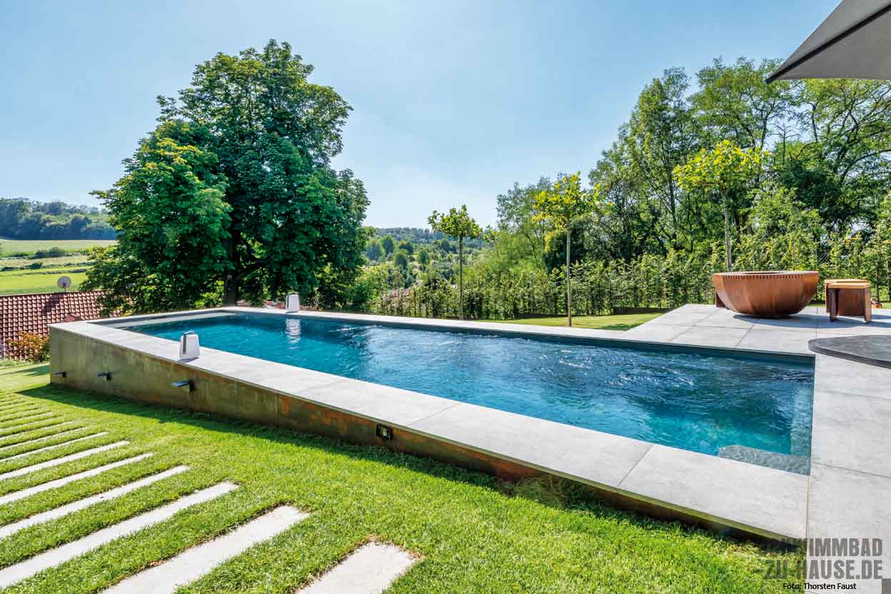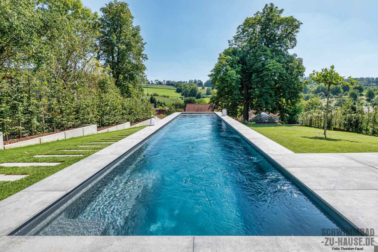 Höher, weiter, schneller, dies sind ohne Frage drei Attribute, die den neuen Pool im Garten der Bauherrenfamilie aus Groß-Umstadt in der Nähe von Aschaffenburg treffend beschreiben. Das Becken mit einer stattlichen Länge von 11,86 Meter und einer schmalen Breite von 2,59 Meter fügt sich perfekt in das Grundstück hinter dem Haus ein und ist seit seiner Fertigstellung zum Lieblingsort der gesamten Familie avanciert. Besonders der als Bauingenieur tätige und in seiner Freizeit als Triathlet aktive Familienvater nutzt das heimische Badeparadies täglich. Mit dem Pool hat er einen zuverlässigen und leistungsstarken Trainingspartner gefunden.