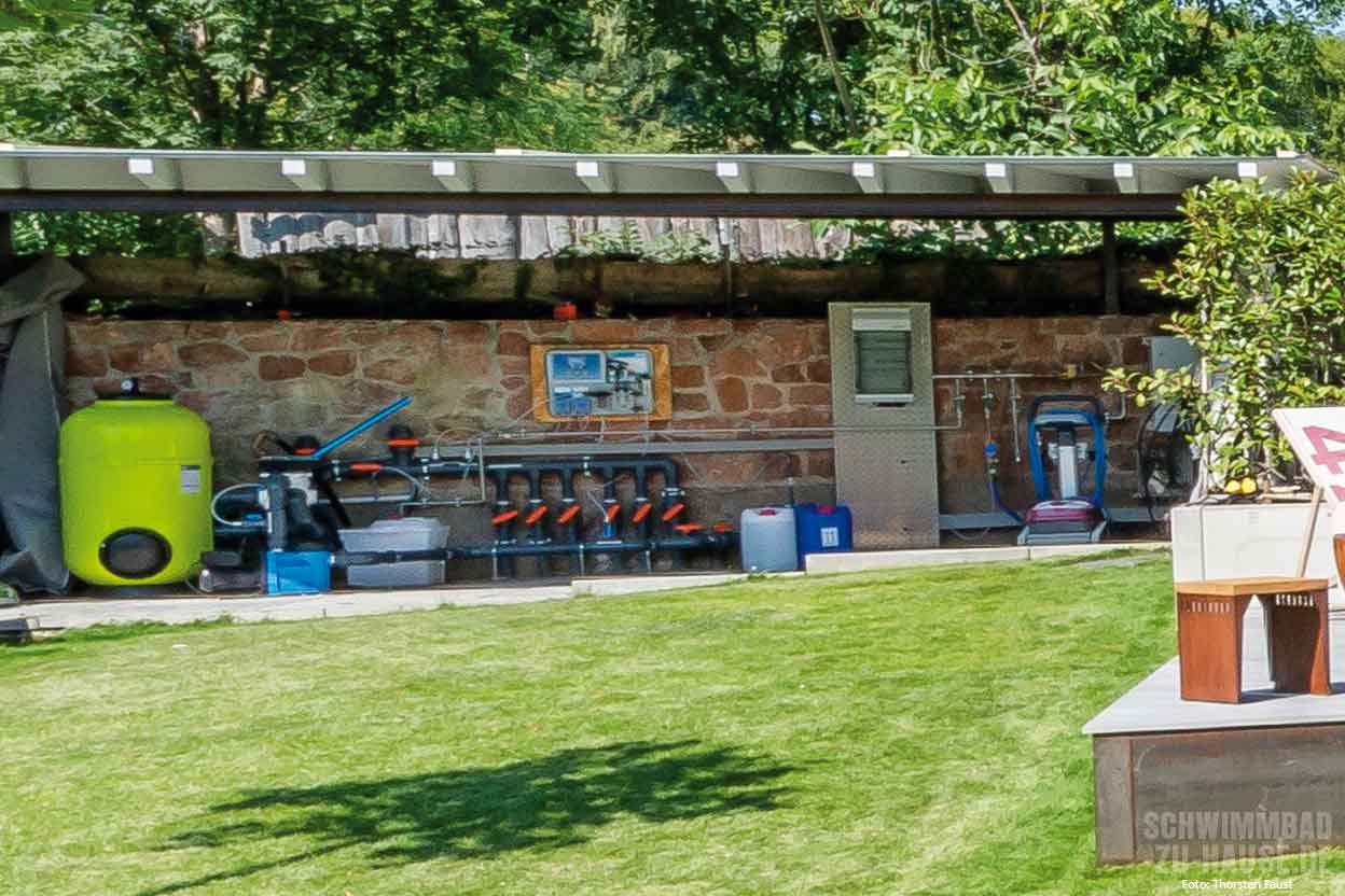 Die Umsetzung eines derartig individuellen Projekts erfordert fachliches Know-how, Erfahrung und Fingerspitzengefühl. Thorsten Staab erläutert dies: „Aufgrund der geringen Beckenbreite musste beispielsweise ein Sonderschacht für die Gegenstromanlage gefertigt werden.“ Klar, dass auch die anderen Schwimmbadfeatures qualitativ in der gleichen Liga spielen wie die hochwertige Gegenstromanlage. Eine Rollladenabdeckung im Alu-Look schützt bei Nichtbenutzung vor Wärmeverlusten, eine drehzahlgesteuerte Filterpumpe minimiert die Betriebskosten und die Beheizung des Wassers via Full-Inverter-Wärmepumpe ist besonders nachhaltig.