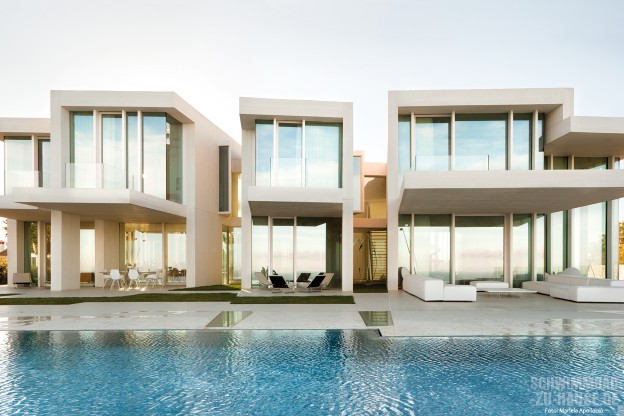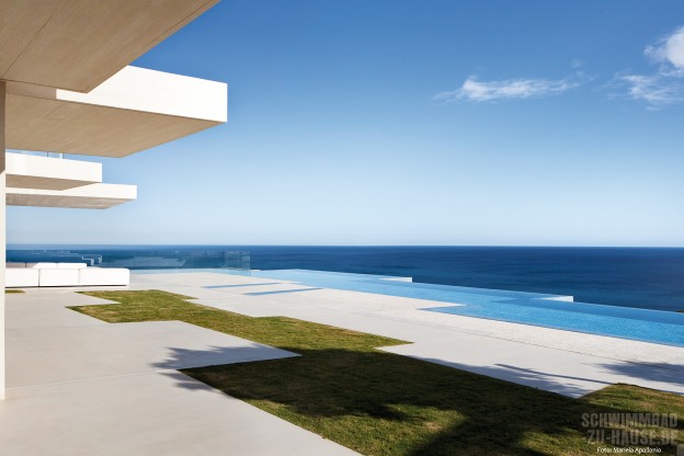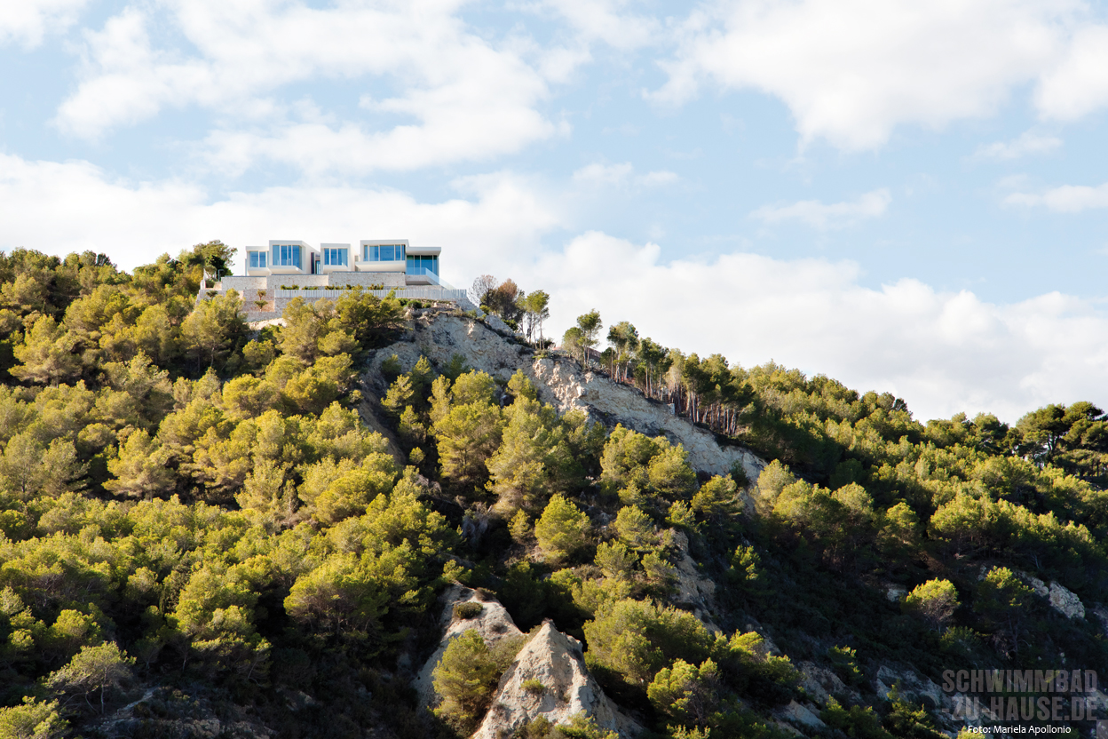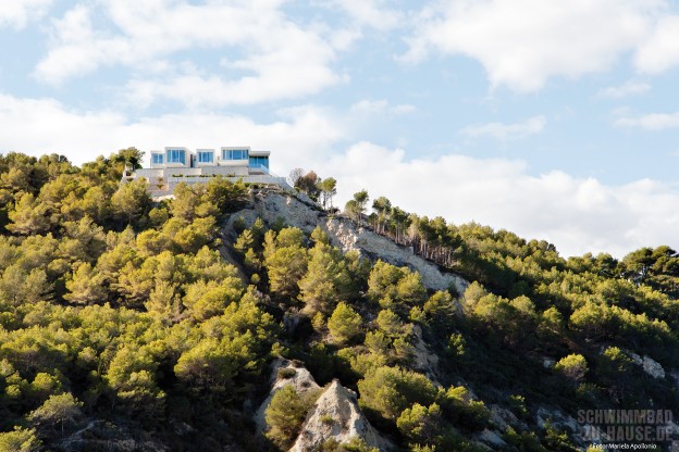 Das Architektenteam um Ramón Esteve war sich dabei von Anfang an der Tatsache bewusst, dass die einzigartige Lage des Grundstücks geradezu dafür prädestiniert ist, ein Statement in Sachen Design zu setzen. Deshalb entschloss man sich bei der Umsetzung des gesamten Projekts, auf wenige Baumaterialien zurückzugreifen, um einem Verwässern der modernen und minimalistischen Geradlinigkeit entgegenzuwirken. So entstand ein Anwesen mit expressivem tektonischem Charakter, das mit der Ähnlichkeit zwischen weißem Holz und Beton spielt. Zudem hat der bewusste Einsatz von Glas und Wasser nicht nur moderne Transparenz zum Ziel, sondern soll auch Schwerelosigkeit vermitteln. Das ist den Architekten bestens gelungen, denn die scheinbar fehlende Bodenhaftung ist einer der zentralen Reize, die dieses Anwesen ausstrahlt.