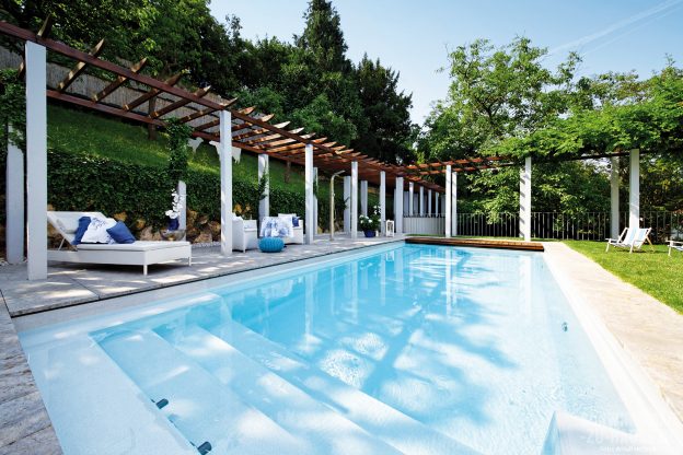 „Der neue Pool sollte sich in Form und Gestaltung harmonisch in das Gesamtbild des bestehenden Gartens einfügen, den Charakter des Hauses widerspiegeln und gleichzeitig eine angemessene Größe zum Schwimmen aufweisen“, beschreibt der zuständige Schwimmbadbauer Claus Kissel die Wünsche der Bauherrn. So entschied man sich für ein 8,45 Meter langes, 3,7 Meter breites und 1,5 Meter tiefes GFK-Becken „D-Line Linear 845“ von Riviera Pool, das den geradlinigen Charakter des Wohnhauses aufgreift. Der Laubengang hinter dem Pool schafft eine besondere Dynamik, indem die vertikalen, grau gestrichenen Pfeiler einen Gegenpol zu den horizontalen Perspektiven des Wasserspiegels und der Beckenumrandung bilden. Zudem trägt die Pergola, an der schon in wenigen Jahren Pflanzen hochranken werden, zur Gemütlichkeit des Familienrückzugsortes bei.