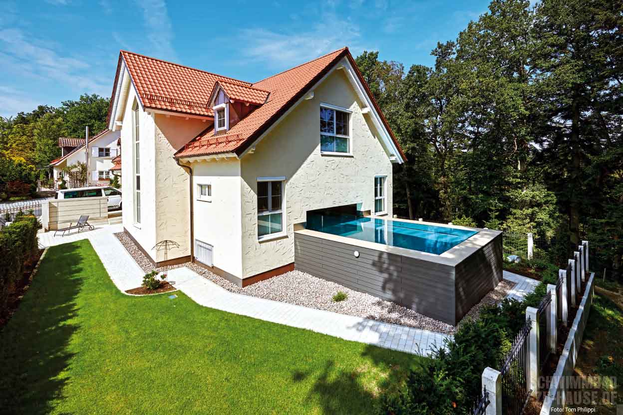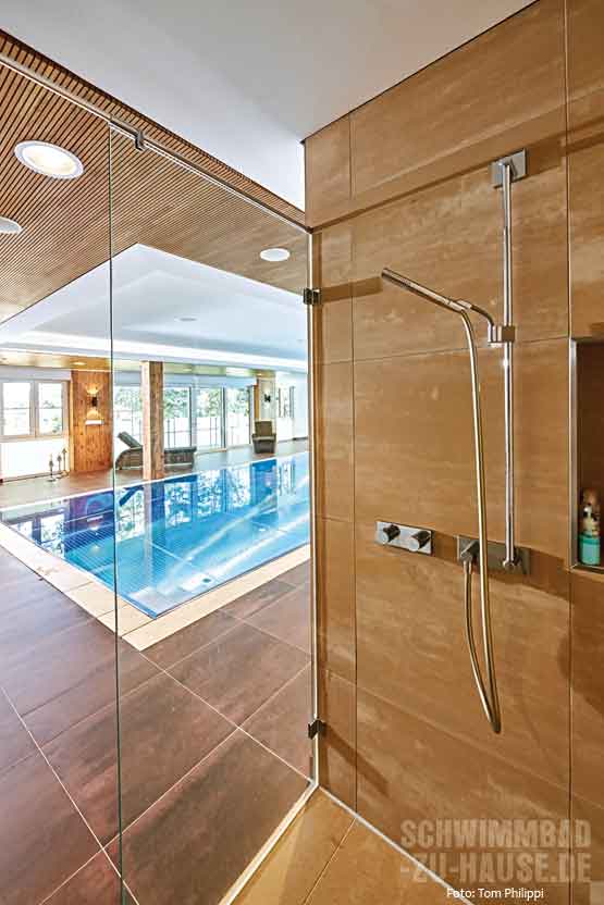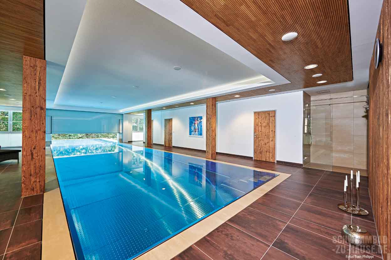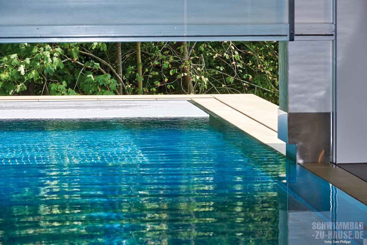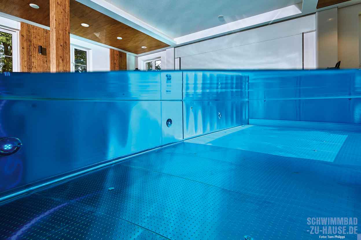 erinnert sich Poolprofi Ewald Ettl. „Erstens war die Zufahrt zum Grundstück so beengt, dass kein Lkw an die Baustelle heranfahren konnte. Dadurch schloss sich ein Einstückbecken aus. Zum Zweiten war es der Wunsch des Bauherrn, dass der Innenpool um ein Außenbecken erweitert wird und eine Durchschwimmmöglichkeit vorhanden sein sollte.“ Ettl empfahl ein Edelstahlbecken, das in einzelnen Platten angeliefert und dann an der Baustelle zusammengeschweißt wird. Bauherr und Architekt stimmten zu: Design des Edelstahlpools und konstruktive Möglichkeiten des Beckensystems gefielen. So entwarf der Fachmann einen 14 Meter langen Pool für den Innenbereich und ein sechs Meter langes Becken im Freien, sodass dem Bauherrn 20 Meter durchgehende Schwimmfläche zur Verfügung stehen. Eine Glasscheibe, die vom Obergeschoss herabfährt, trennt die beiden Beckenteile voneinander ab und der Bau-