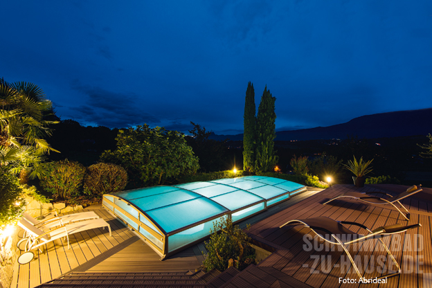 Beleuchtete Überdachungen verbreiten ein angenehmes Ambiente. Die „Stretto“ ist eine teleskopische Schwimmbadüberdachung, die sich kinderleicht verschieben lässt. Aufgrund der einseitigen Schienenführung bleibt die Zugangsseite schienenfrei. Von Abrideal